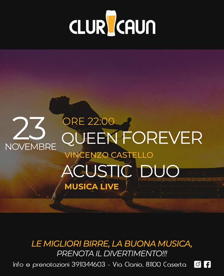 CASERTA (red.cro.) – Proseguono gli appuntamenti con il divertimento e la buona musica nei weekend del Cluricaun. Virtuosismi e sensibilità artistica delle esibizioni accompagnati dalle tante novità gastronomiche, sono gli ingredienti che certamente non mancheranno. Domani sera, 22 novembre, l’appuntamento con la musica live dei “Jus & Blues” alle ore 22. Sabato 23 novembre, invece, sarà la volta dei “Queen Forever” con Vincenzo Castello “Acustic Duo”. Per prenotazioni e informazioni telefonare al 3911344603.