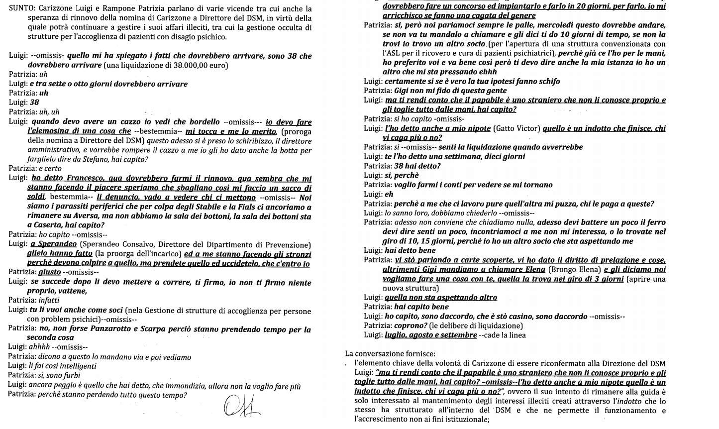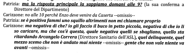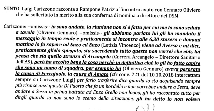Nel passaggio che potete leggere alla fine dell’articolo, emerge una certa rabbia nelle conversazioni tra Carizzone e la sua amante, nonché segretaria, Patrizia Rampone. La preoccupazione, la sensazione di sentirsi accerchiato e una certa animosità verso la proroga dell’incarico, che lui non aveva ricevuto, al direttore del dipartimento di Prevenzione, Consalvo Sperandeo, si esprimeva anche attraverso un certo turpiloquio da parte della coppia clandestina. La sensazione di sentirsi sotto attacco degli Stabile, poi, porta Carizzone a spingersi vero Oliviero, al quale è stato contestato il reato di traffico di influenze, con “il cappello in mano” per chiedere il rinnovo della sua posizione come direttore del dipartimento di Salute Mentale dell’Asl Caserta.
