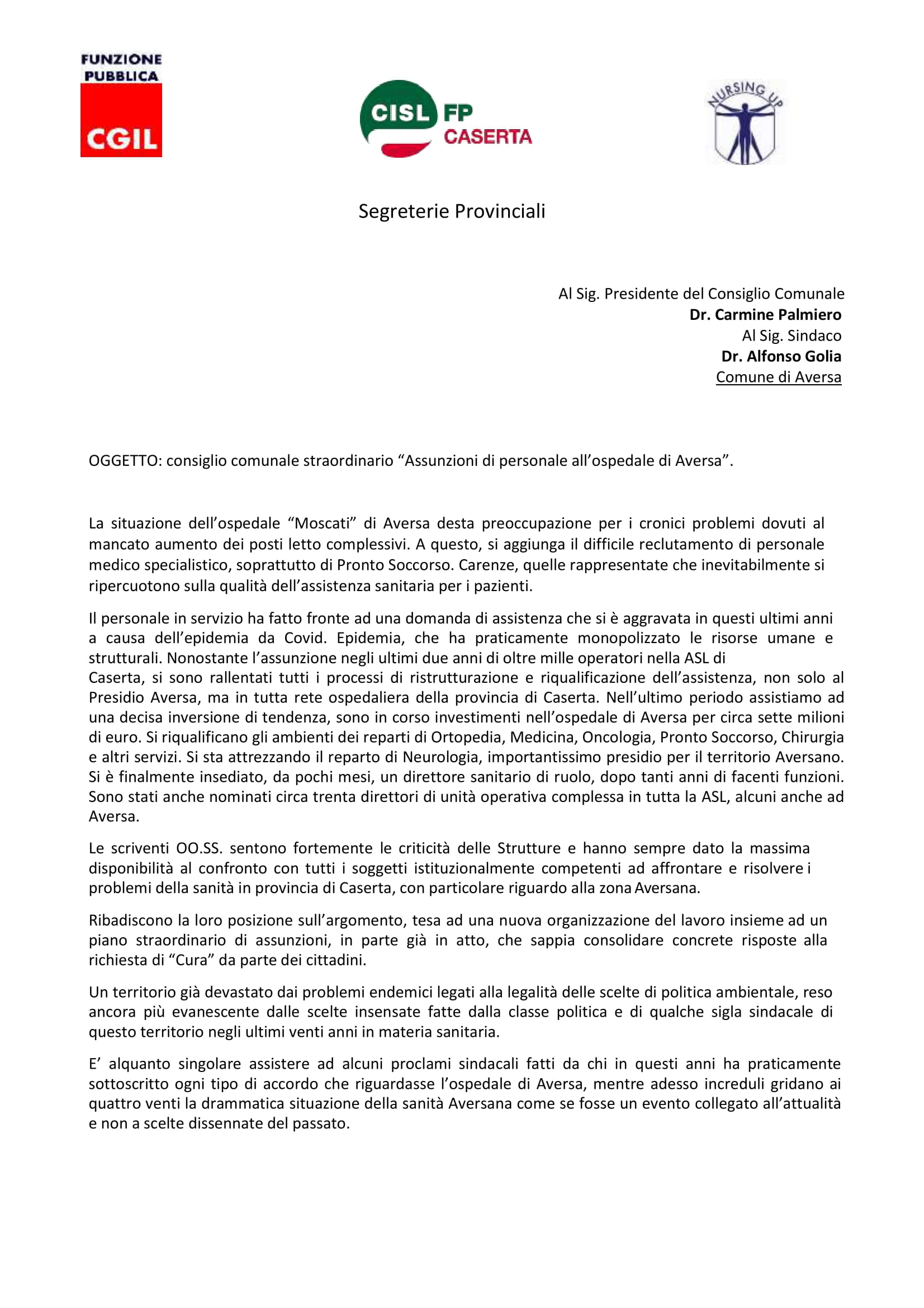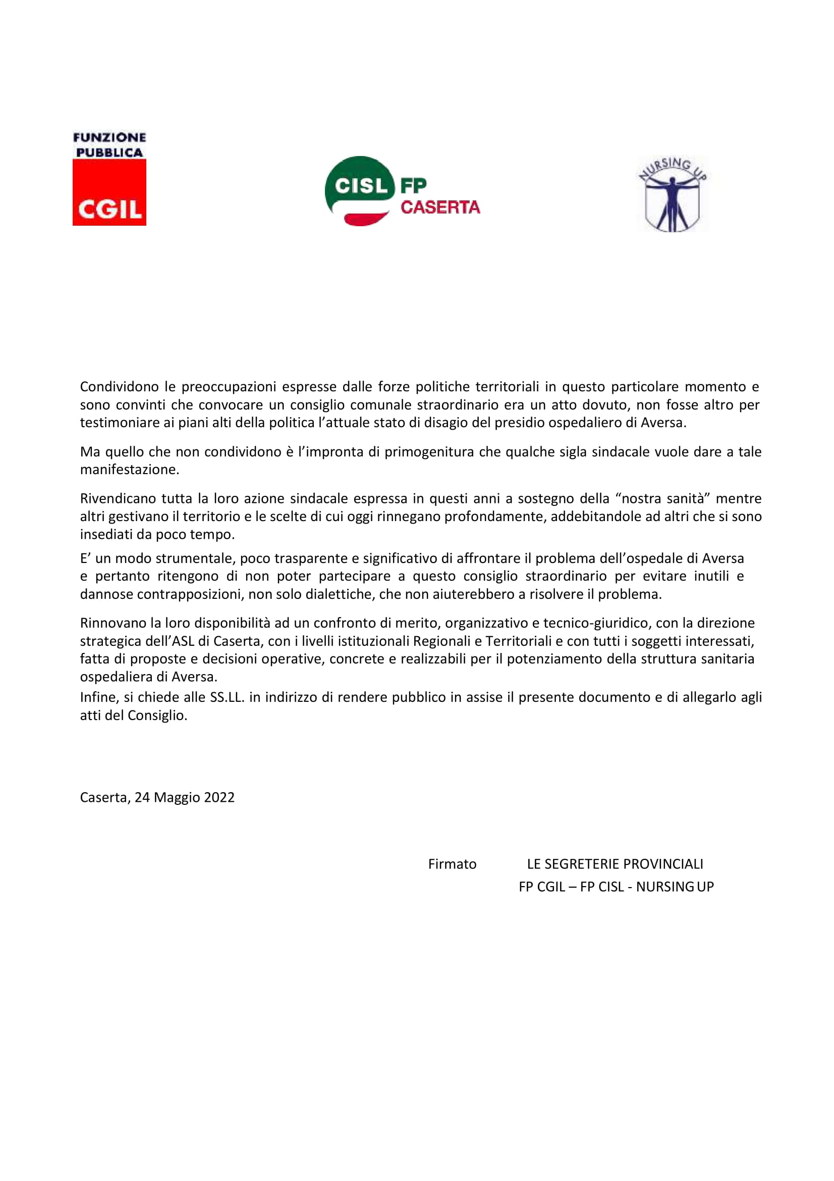AVERSA (g.g.) – Il documento, firmato nei giorni scorsi dai principali sindacati del Comparto sanitario, infermieri, OSS e tecnici, (con il testo integrale in calce a questo articolo), rappresenta un atto dovuto e, tutto sommato, scontato.