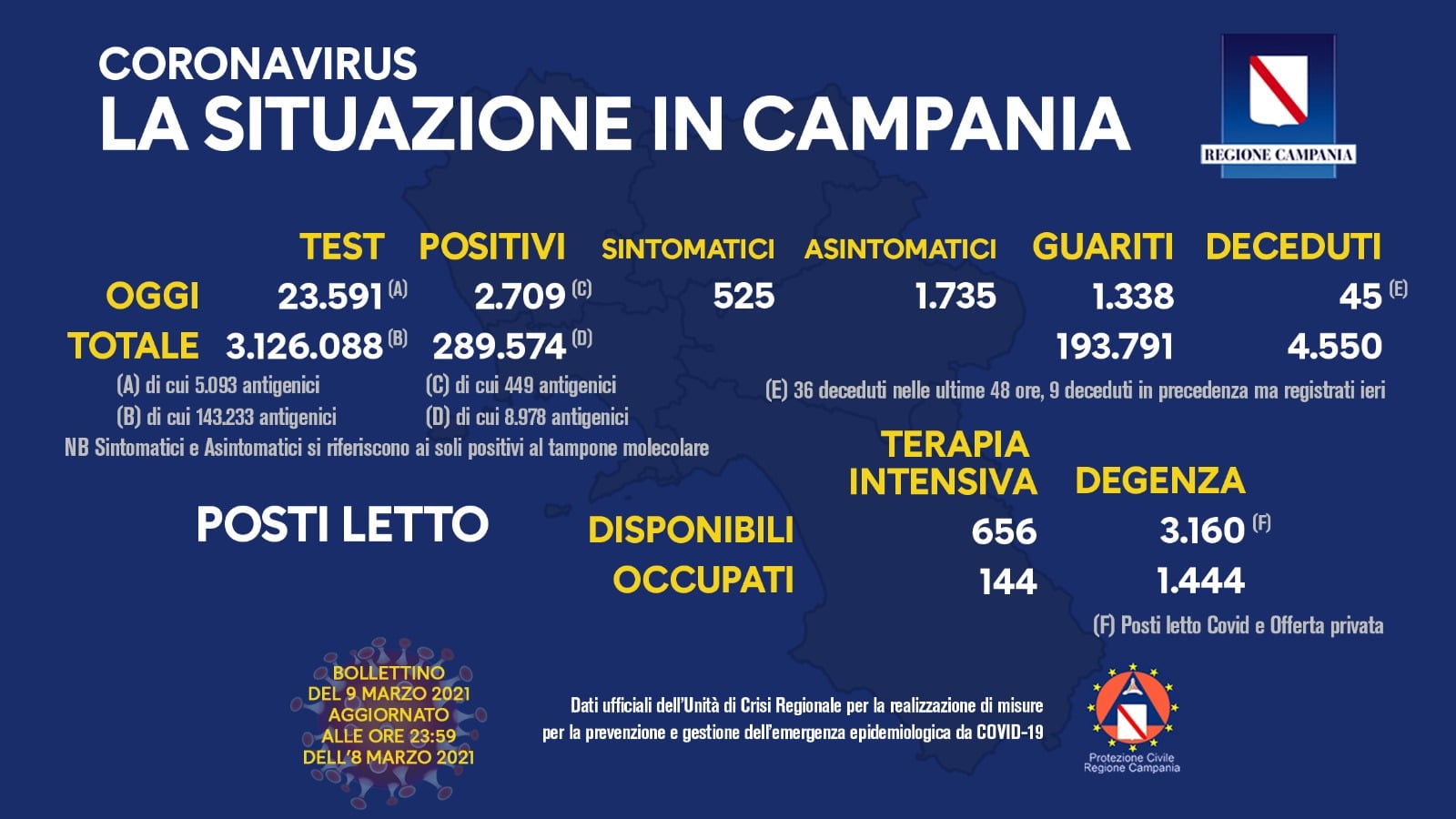 In Campania, nelle ultime 24 ore, si sono registrati 2.709 positivi al Coronavirus, di cui 449 casi identificati da test antigenici rapidi, 1.338 guariti e 45 decessi, di cui 36 nelle ultime 48 ore e 9 deceduti in precedenza, ma registrati ieri. Gli asintomatici sono 1.735 e i sintomatici 525, riferiti ai soli positivi al tampone molecolare. A comunicarlo l’Unità di crisi regionale. Il totale dei contagi da Covid-19, da inizio pandemia, sale a 289.574 (di cui 8.978 antigenici), i morti sono 4.414 e le guarigioni 193.791. I tamponi processati complessivamente 3.126.088 (143.233 antigenici) di cui 23.591 eseguiti ieri, dei quali 5.093 antigenici. Il report posti letto su base regionale riporta 656 posti letto di terapia intensiva disponibili, di cui 144 occupati mentre i posti letto di degenza disponibili, tra posti letto Covid e offerta privata 3.160, di cui 1.444 occupati.