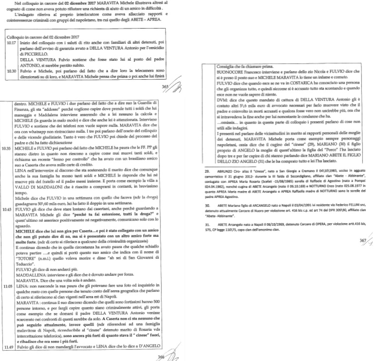 Maravita ha difficoltà a configurarsi come boss con i suoi adepti, anche perché sta sempre lì a tessere le lodi dei camorristi napoletani, che ammira così come un giovane può ammirare una rockstar. I suoi discorsi lo portano sempre lì. Rivela di essere stato anche direttamente a San Giovanni a Teduccio, incrociando la preoccupazione di sua moglie che ben si rende conto del fatto che quella camorra è terribilmente sanguinosa. La cosa, però, non pare preoccupare Maravita, che continua a parlare del clan Abete-Aprea, scaturito dalle scissioni dei cartelli di Seciondigliano-Scampia. Sa tutto di loro, Maravita. Cita Il Cinese, cioè Ciro Abrunzo, ucciso in un agguato nel 2012. Ma soprattutto descrive con precisione cosa è avvenuto dopo la morte di questi. Non manca anche il racconto gossip che è molto congeniale al carattere e agli usi di Michele Maravita, sempre in salsa napoletana, riguardante l’abbandono proprio del nipote de O’Cinese da parte della moglie.