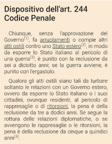 A parte la parzialità e l’opinabilità della versione (Israele, dall’operazione militare Piombo Fuso del 2008-2009 ha istituito il blocco navale sulla striscia di Gaza in risposta agli attacchi che da essa gli venivano), fanno finta di non sapere che prima ancora la propria iniziativa, gravemente irresponsabile, ha violato l’articolo 244, 2° comma, del codice penale italiano (nella foto a lato, il testo della norma). E qui si dovrebbe aprire un altro capitolo sui magistrati che si appellano all’obbligatorietà dell’azione penale che incomberebbe loro, ma che restano inerti in situazioni estreme come questa. Ma rischieremmo di divagare e dunque andiamo oltre.