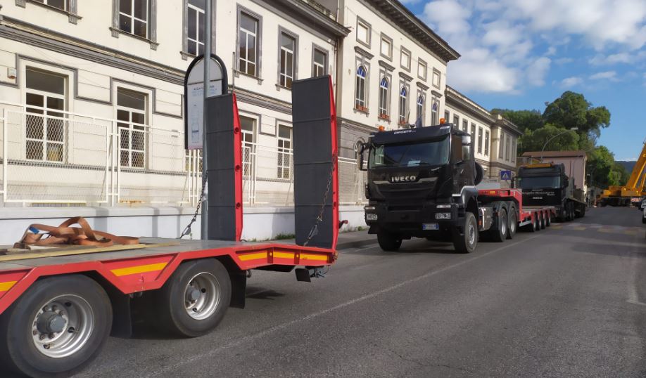 Incolonnati davanti alla scuola elementare “Giannone” ci sono 3 tir con rimorchio che hanno trasportato l’enorme gru e che poi gli operai hanno provveduto a montare. Un’operazione davvero difficile e di dimensioni impressionanti.