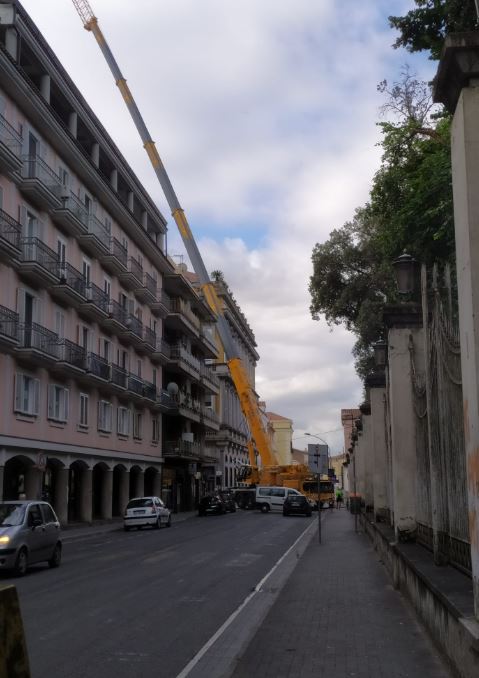 CASERTA – Non c’è pace da un po’ di giorni, per i residenti e per chi deve, per necessità, transitare in corso Giannone. Dopo la chiusura temporanea dell’arteria, qualche giorno fa, per il crollo su di un’auto di un enorme ramo staccatosi da uno degli alberi secolari all’interno del Parco della Reggia, questa mattina, i cittadini casertani che abitano in zona, hanno dovuto di nuovo fare i conti con una nuova chiusura della via. Sul posto infatti, davanti all’entrata della Reggia per intenderci, c’è una mastodontica gru, manovrata da operai specializzati, che stanno provvedendo a mettere in sicurezza il tetto del palazzo dell’ex King House al civico 44, uno degli edifici più chic del circondario.
