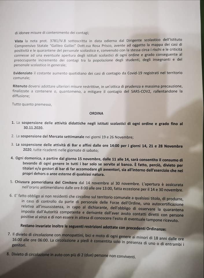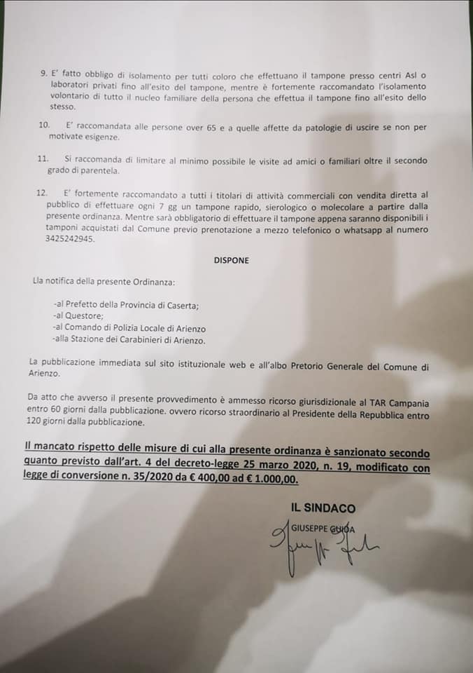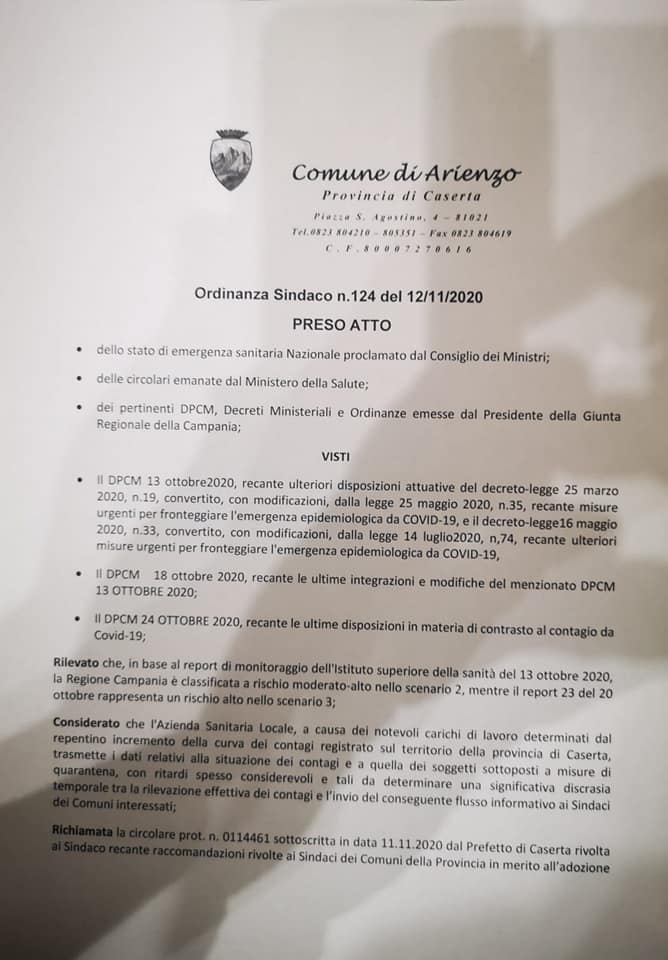ARIENZO – Disposizioni più rigide per contenere ulteriormente i contagi: è quanto stabilito dal sindaco di Arienzo Giuseppe Guida, che ha sottoscritto una nuova Ordinanza, nella giornata di ieri, contenente altre regole per i cittadini, per le Scuole di ogni ordine e grado e per talune attività, nel tentativo di tenere sotto il massimo controllo la situazione epidemiologica attuale sul territorio, che fa registrare un numero di positivi pari a 160. Nello specifico, con l’Ordinanza n. 124, che fa seguito sia a una circolare del Prefetto di Caserta che, rivolgendosi ai Sindaci della Provincia, chiede ulteriori misure di contenimento, sia alle criticità nella riapertura delle Scuole, convenute con la Dirigente scolastica dell’I. C. ‘Galileo Galilei’, si dispone quanto segue: sospensione delle attività didattiche in presenza negli Istituti scolastici di ogni ordine e grado fino al 30 novembre 2020; sospensione del Mercato settimanale nei giorni 19 e 26 novembre; sospensione nelle attività di Bar e affini, dalle ore 14, nei giorni 14, 21 e 28 novembre (tutti ricadenti nella giornata del sabato); obbligo ogni domenica, a partire dal giorno 15 novembre, dalle ore 11 alle 14, di fare servizio esclusivo al banco e conseguente divieto per titolari e/o gestori di Bar di far accomodare gli avventori all’interno dell’esercizio, nei dehors o in qualunque spazio esterno; chiusura pomeridiana del Cimitero dal 14 al 30 novembre, mentre sarà assicurata quella antimeridiana, dalle ore 8 alle 13, fatta eccezione per i giorni 14 e 30 novembre; in caso di controlli da parte delle Forze dell’Ordine, obbligo di esibire autocertificazione per i non residenti che circolino sul territorio, con dichiarazione, sotto la propria responsabilità, di non essere sottoposti a quarantena e di non essere in attesa di esito di eventuali tamponi. Le disposizioni seguono a quelle contenute nell’Ordinanza n. 113 del 6 novembre 2020, che, come specificato, restano valide a tutti gli effetti. In particolare, restano invariate le seguenti disposizioni: divieto di circolazione in macchina con più di due persone non conviventi; divieto di circolazione per i minori di anni 18, dalle ore 16 alle 6 del giorno successivo, in monopattino, bici o moto, mentre possono circolare a piedi solo se accompagnati da uno o entrambi i genitori; obbligo di isolamento per coloro che siano in attesa di esito del tampone, effettuato in struttura pubblica o privata, mentre è raccomandato l’isolamento di tutto il nucleo familiare della persona che lo effettua, fino all’esito stesso; è raccomandato agli over 65 di non uscire, se non per stringenti necessità; si raccomandano minime visite ad amici o familiari oltre il secondo grado di parentela; è raccomandato ai commercianti di effettuare il tampone ogni 7 giorni, mentre sarà obbligatorio appena saranno disponibili i kit acquistati dal Comune, in arrivo nei prossimi giorni, prenotando al telefono o con un messaggio WhatsApp al numero 3425242945. Le infrazioni sono punibili con sanzioni amministrative da euro 400,00 a euro 1.000. Inoltre, Il primo cittadino ha chiesto alle Forze dell’Ordine, non solo di Arienzo, un maggiore controllo ricevendo, proprio in questi giorni, rassicurazioni su una presenza più assidua. Sul numero dei contagi e sulle nuove Ordinanze, Guida ha, poi, dichiarato: “La curva dei contagi è attualmente in calo, ma è proprio ora che occorre procedere con il massimo rigore e ottenere, da parte dei cittadini, tutta la collaborazione possibile; il rispetto di tali regole ci consentirà di ristabilire un equilibrio, difficile da ottenere e mantenere in un periodo così delicato per tutti, e siamo pronti ad introdurre altre disposizioni, ancora più rigide, in caso di mancato rispetto di quelle attuali”.
