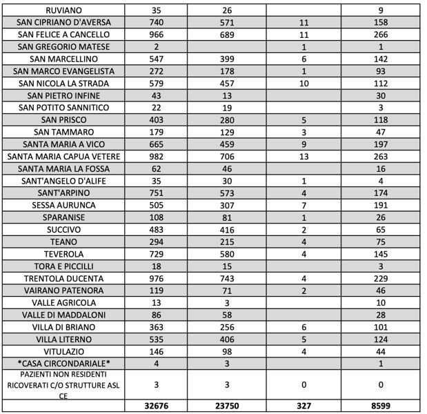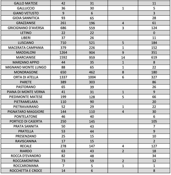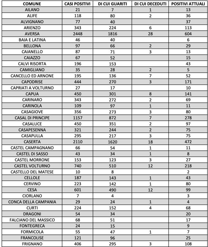 I nuovi positivi sono residenti ad Alife, Alvignano, Arienzo, Aversa (4), Caiazzo (2), Capodrise (2), Capua (4), Carinaro, Casagiove, Casal di Principe (8), CAsaluce (2), Casapesenna, Caserta (5), Castel Morrone, Castel Volturno (3), Cellole, Cervino (2), Cesa (3), Dragoni, Falciano del Massico, Frignano (4), Grazzanise (3), Gricignano d’Aversa (2), Lusciano, Macerata Campania (3), Maddaloni (5), Marcianise (12), Mignano Monte Lungo, Mondragone (9), Orta di Atella (8), Piedimonte Matese, Pietramelara (2), Pietravairano (4), San Cipriano d’Aversa, San Felice a Cancello (9), San Marcellino (7), San Marco Evangelista (4), San Nicola la Strada (3), San Prisco, Santa Maria a Vico (6), Santa Maria Capua Vetere (2), Sant’Arpino (5), Succivo (3), Teano (3), Teverola (3), Trentola Ducenta (2), Vairano Patenora (3), Valle di Maddaloni (3), Villa di Briano (2), Villa Literno (3).