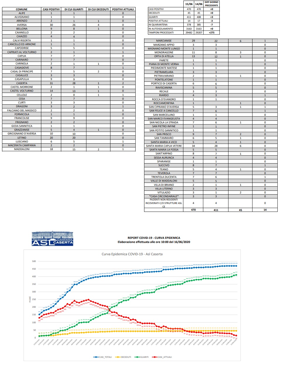 CASERTA (red.cro.) – L’Asl Caserta ha reso noto i dati relativi alla provincia di Caserta e i casi di contagio di oggi, 16 giugno, dati aggiornati fino alle ore 11, con tutti i numeri relativi i 104 comuni della provincia.