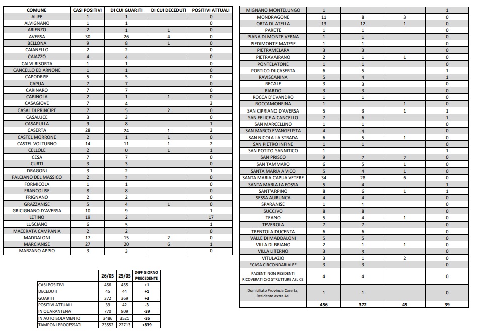 CASERTA (red.cro.) – L’Asl Caserta ha reso nota la tabella relativa a tutti i comuni della provincia di Caserta e i casi di contagio di oggi, 27 maggio, che riguardano sempre le 24 ore precedenti.
