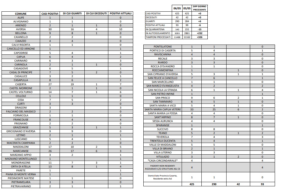 CASERTA – L’ASL di Caserta ha pubblicato poco fa il dato dei casi di contagio nella nostra provincia delle ultime 24 ore. Attualmente i positivi nella nostra provincia sono 99 (- 6 nelle ultime 24 ore), ma il contagio nelle ultime 24 ore è a quota zero. Dall’inizio dell’epidemia, in Terra di Lavoro abbiamo avuto 425 persone positive, di cui 290 (+6) sono guarite, mentre 42 (=) sono stati i decessi.