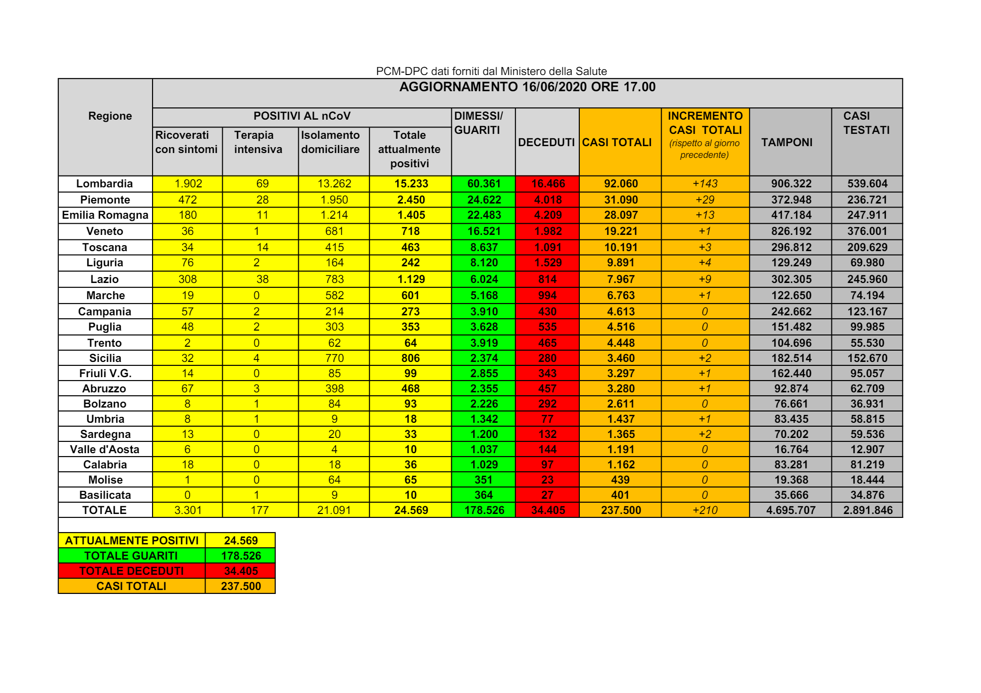 Degli 210 tamponi positivi rilevati oggi, 143 provengono dalla regione Lombardia. Il 68% dei nuovi positivi italiani provengono da questa regione, dato in calo dopo che ieri si è raggiunta la percentuale più alta dall’inizio del lockdown (85%). Aggiungendo a questo dato anche il numero di nuovi positivi di Piemonte, Emilia Romagna, Veneto, Liguria, si arriva a 281 casi di contagio nelle 5 regioni del Nord più colpite. Parliamo del 90% di tutti i nuovi contagi avvenuti in Italia.