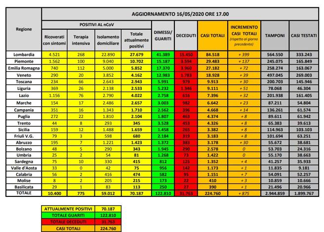 In quarantena domiciliare si trovano 59.012 positivi, 1.459 in meno rispetto a ieri. Nelle ultime 24 ore, i casi analizzati in Italia, cioè le persone sottoposte al tampone almeno una volta, sono stati 40.657, per un totale di 1.899.767.