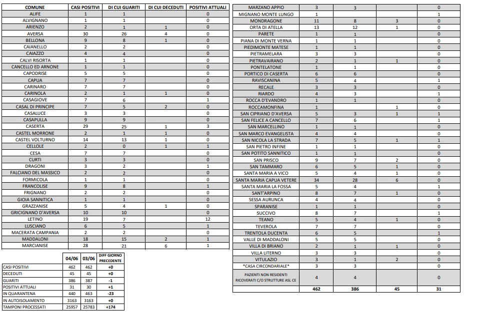 CASERTA (red.cro.) – L’Asl Caserta ha reso noto i dati relativi alla provincia di Caserta e i casi di contagio di oggi, 5 giugno, dati aggiornati fino alle ore 11, con tutti i numeri relativi i 104 comuni della provincia. Secondo i dati dell’Asl, ci sono nuovi contagi in Terra di lavoro nelle ultime 24 ore. Ma resta il fatto che un nuovo positivo c’è, una donna, di Succivo, che era stata colpita dal virus in precedenza ed è tornata a rivivere la malattia. L’Asl di Caserta, con una fantasiosa chiave di lettura, conteggia questi nuovi positivi sottraendo i guariti, provocando quindi una specie di manomissione sulla reale potenza del contagio in provincia di Caserta, .