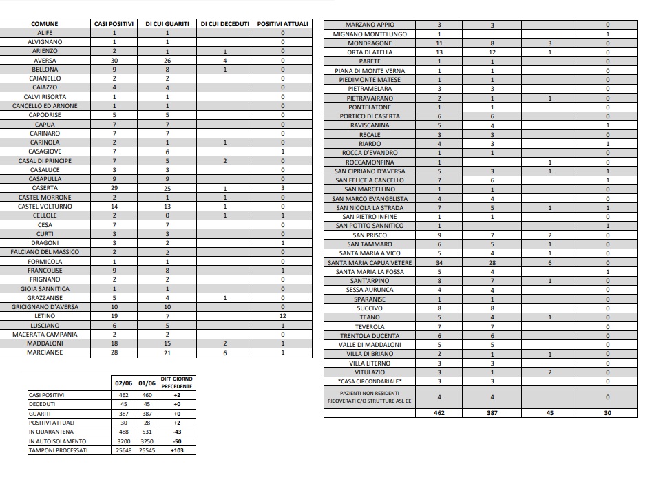 CASERTA (red.cro.) – L’Asl Caserta ha reso noto i dati relativi alla provincia di Caserta e i casi di contagio di oggi, 3 giugno, dati aggiornati fino alle ore 12, con tutti i numeri relativi i 104 comuni della provincia.