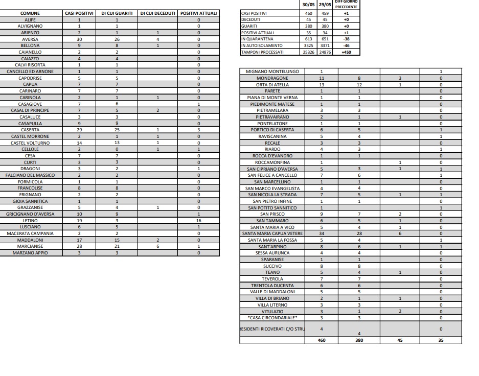 CASERTA (red.cro.) – L’Asl Caserta ha reso noto i dati relativi alla provincia di Caserta e i casi di contagio di oggi, 31 maggio, dati aggiornati fino alle ore 12, con tutti i numeri relativi i 104 comuni della provincia.