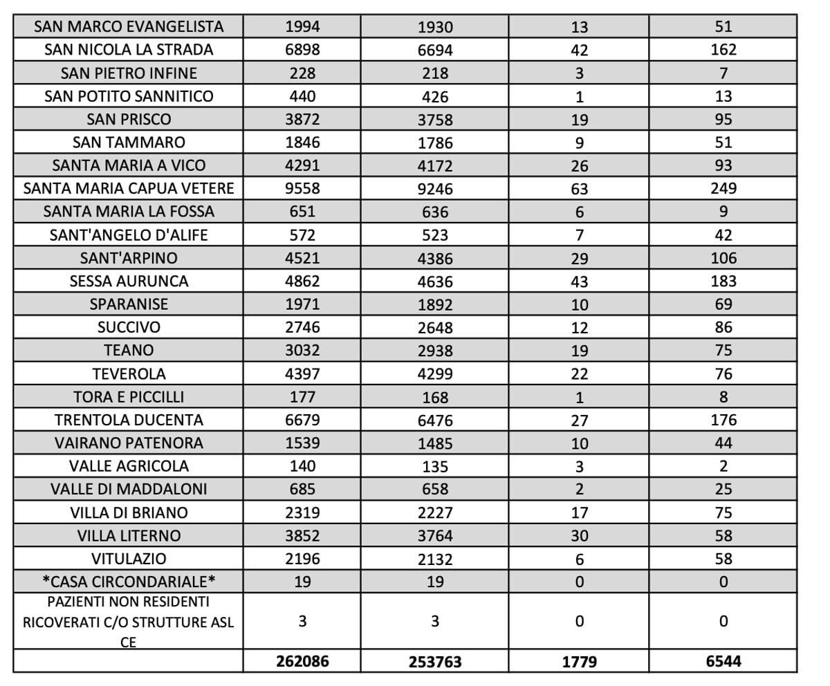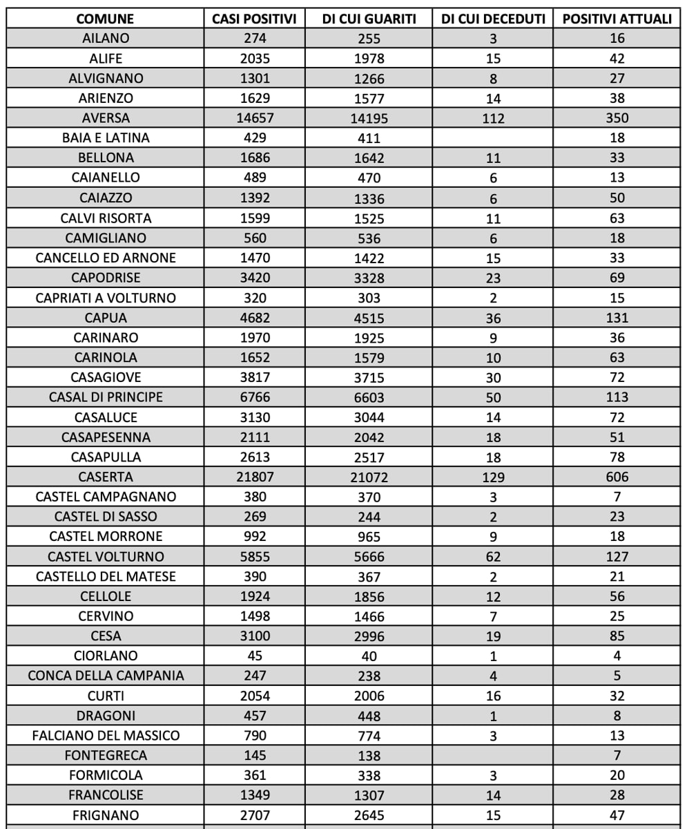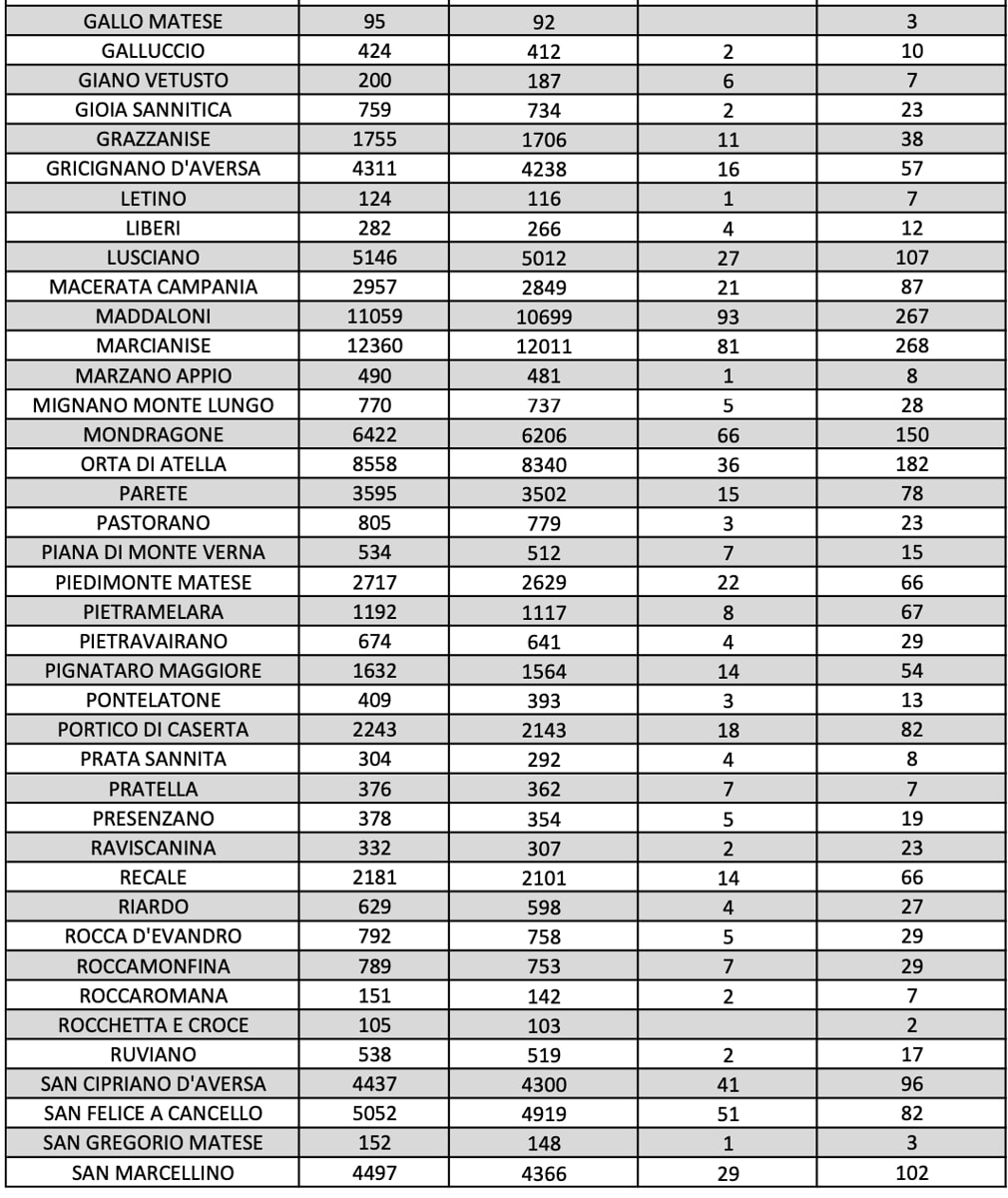 Caserta è il comune che segna ancora il dato più alto di positivi, sono 606 i cittadini ancora contagiati. 350 casi si segnalano ad Aversa, mentre a Maddaloni sono 267, a Marcianise sono 268 e a Santa Maria Capua Vetere sono 249.