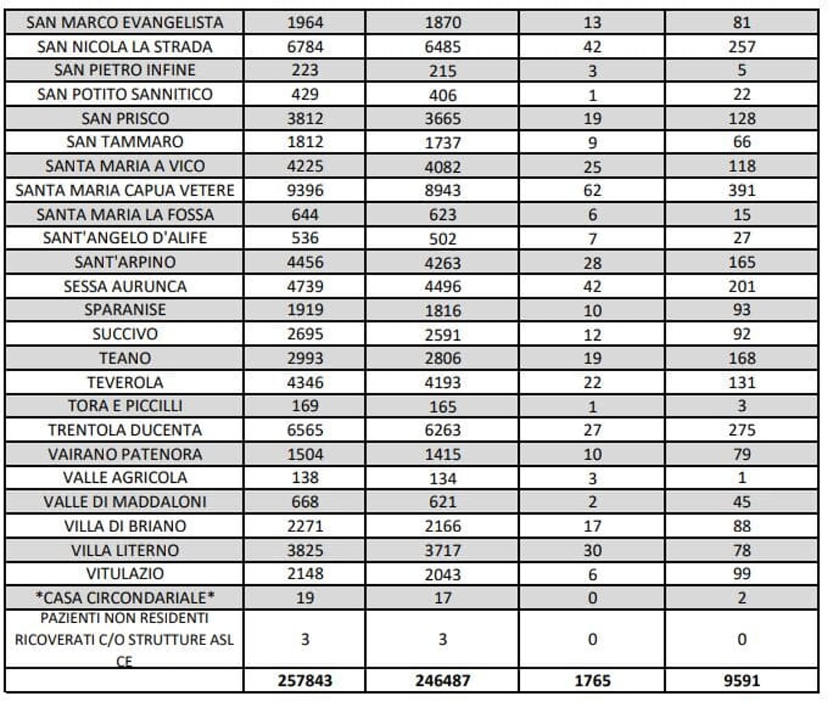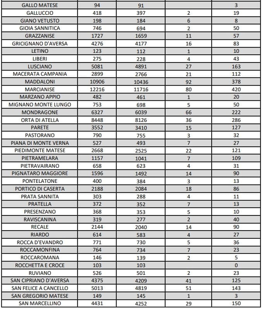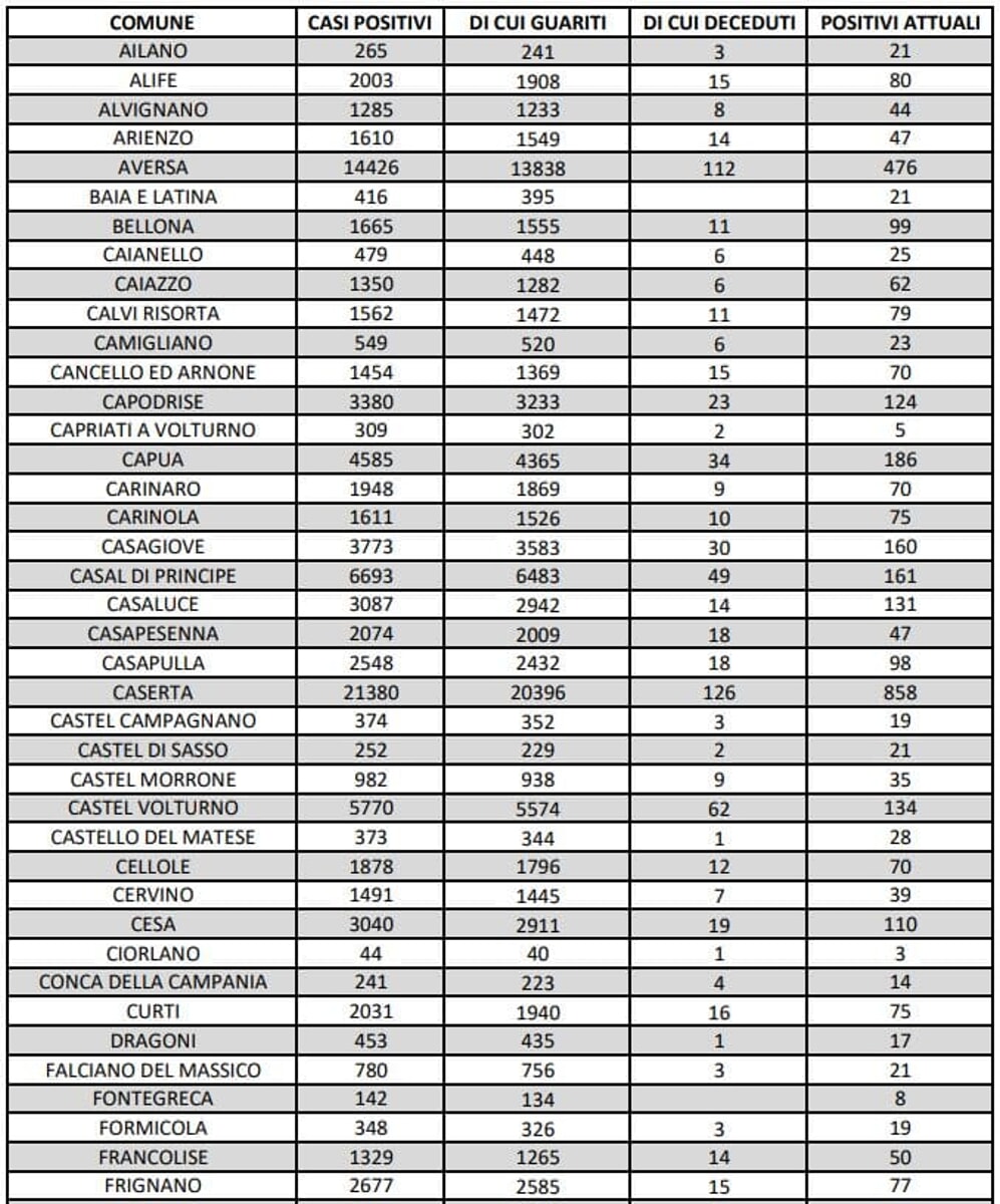 Il comune di Caserta resta la città più colpita della provincia, ma comunque ancora sotto la quota dei 1000 contagiati dopo mesi. Infatti, gli attualmente positivi del comune capoluogo sono 858. Tra i più importanti si segnalano Aversa con 476 casi, Maddaloni con 378, Marcianise con 420 e Santa Maria Capua Vetere con 391.