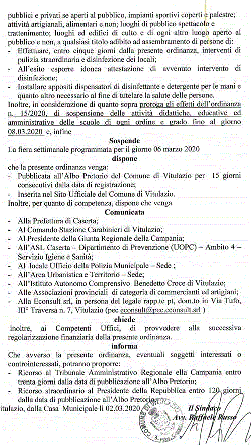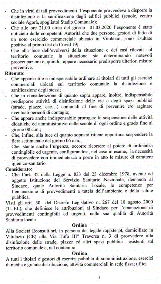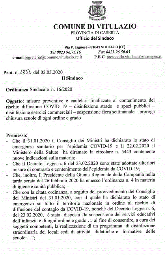 VITULAZIO – Con Ordinanza Sindacale n. 16 del 02.03.2020, in considerazione della nota vicenda che ha visto coinvolte due persone esercenti un ‘attività commerciale di somministrazione di alimenti e bevande a(positive al primo test COVID-19), il Sindaco ha disposto la disinfezione di tutte le strade, le piazze e le aree pubbliche.