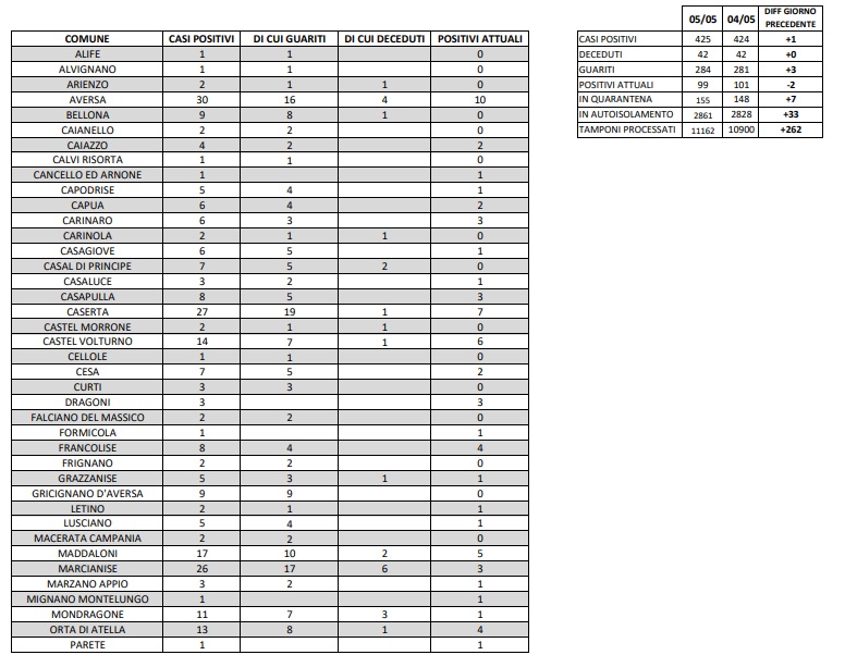 CASERTA (red.cro.) – E’ stato reso noto pochi minuti fa il report dell’Asl Caserta relativo ai dati di oggi, 6 maggio. Continuano le buone notizie per la nostra provincia, infatti, dai tamponi analizzati,si è registrato un solo nuovo caso in provincia di Caserta. Resta fermo a 42 il numero dei decessi. Salgono di 3, arrivando a 284, le persone guarite da coronavirus in provincia di Caserta.