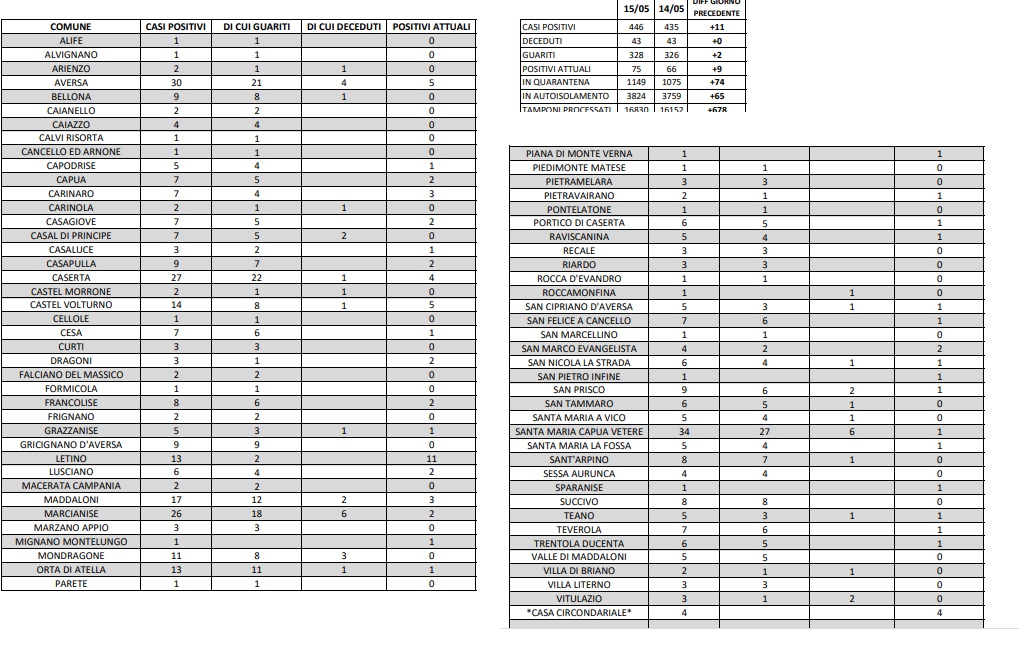 CASERTA (red.cro.) – E’ stato reso noto pochi minuti fa il report dell’Asl Caserta relativo ai dati di oggi, 16 maggio. Considerato il focolaio esploso al comune di Letino, divenuto zona rossa, sale di 11 il numero dei nuovi contagi giornalieri. Resta fermo a 43 il numero dei decessi. Sale, arrivando a 326, la cifra delle persone guarite da coronavirus in provincia di Caserta.