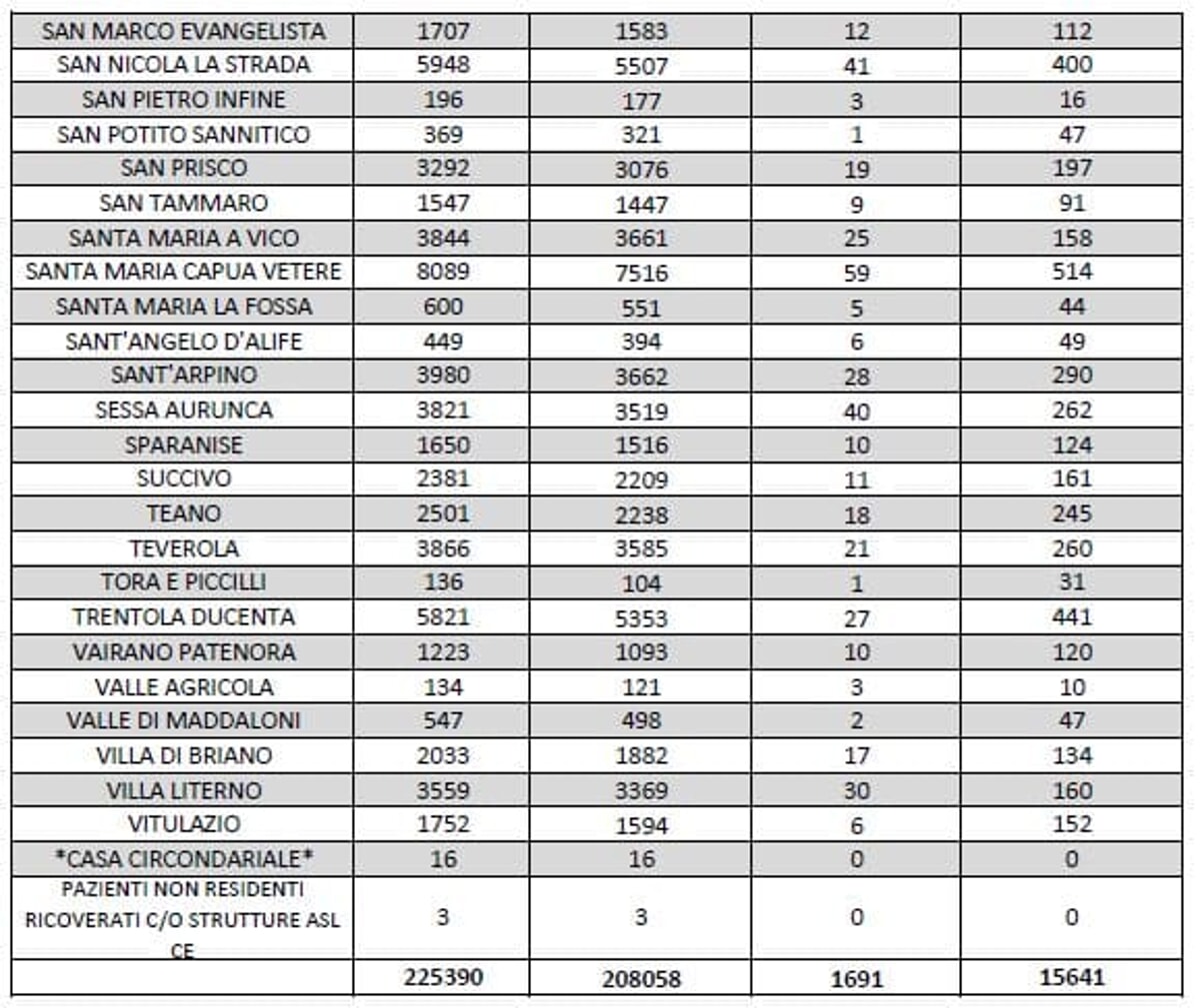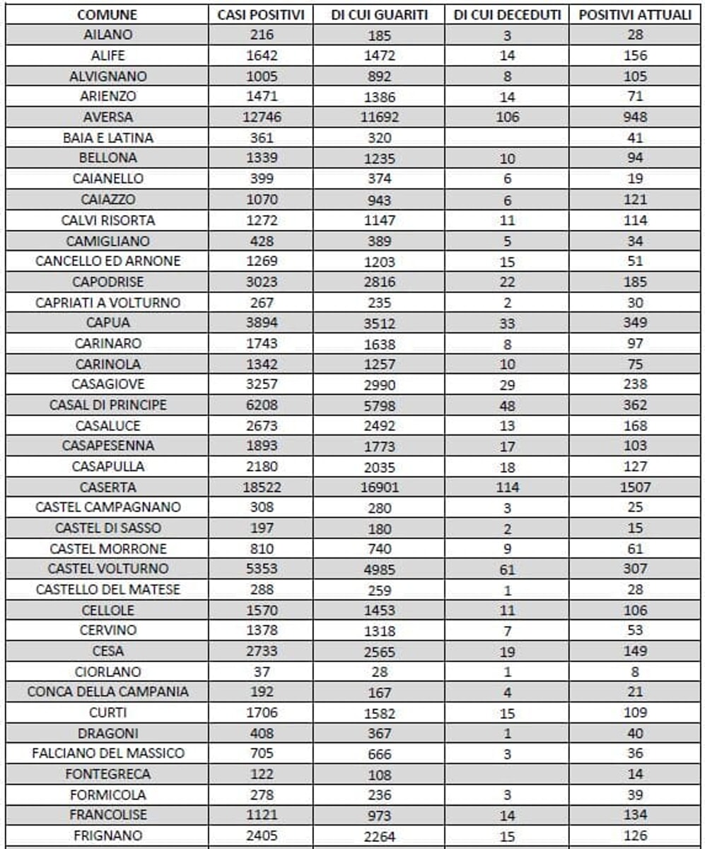COVID A CASERTA E PROVINCIA. I DATI DEL SABATO. Oggi nessun decesso in Terra di Lavoro. LA TABELLA ASL COMUNE PER COMUNE E LE CITTÀ PIÙ COLPITE