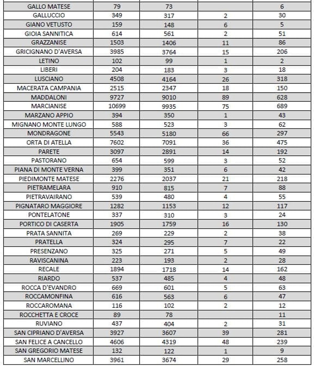 Dall’altro lato della tabella, invece, si segnalano i comuni di Letino, con solo 2 positivi in tutta la popolazione, Giano Vetusto con 5 case, Gallo Matese con 6, Ciorlano con 8 casi e San Gregorio Matese con 9.