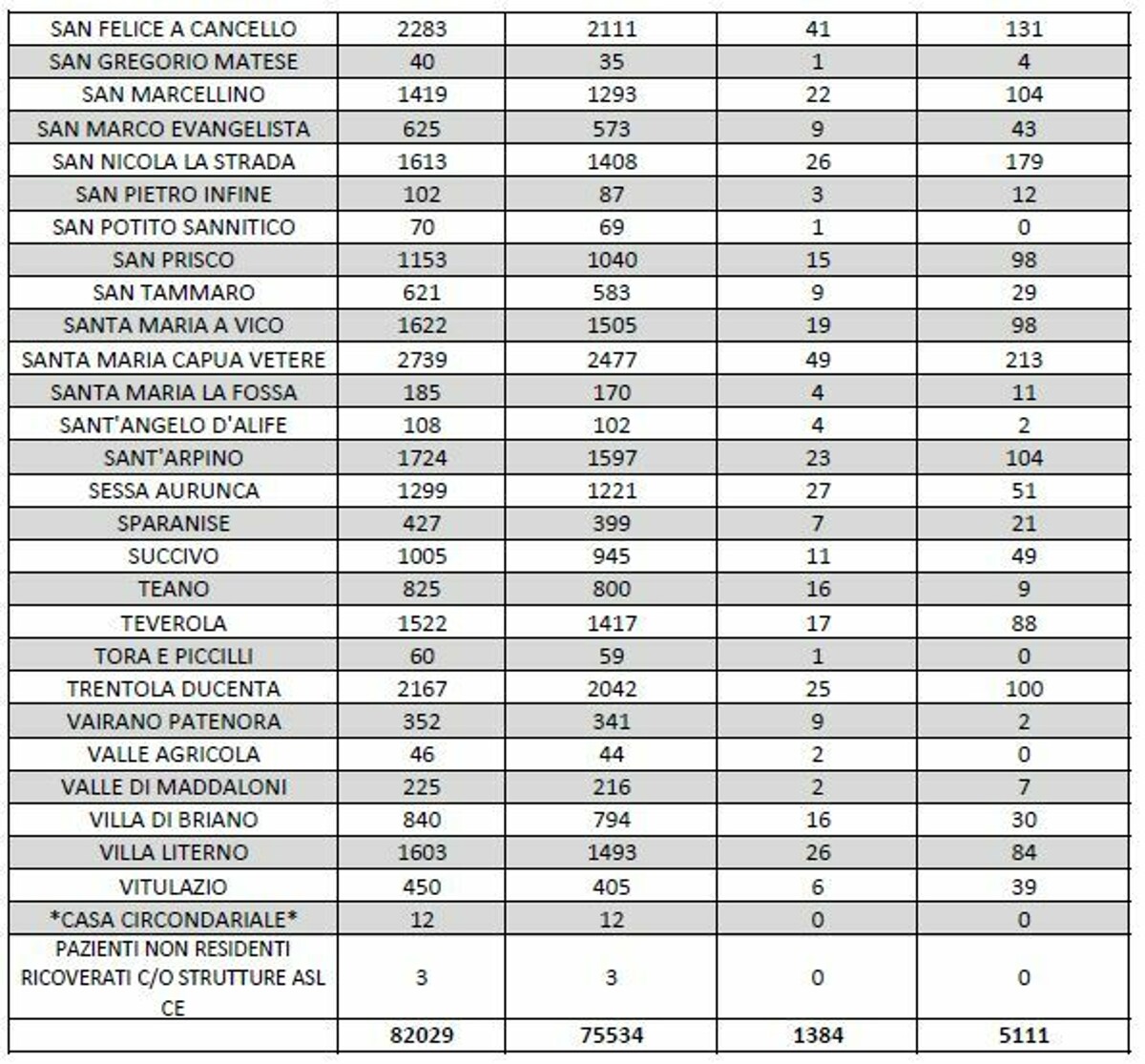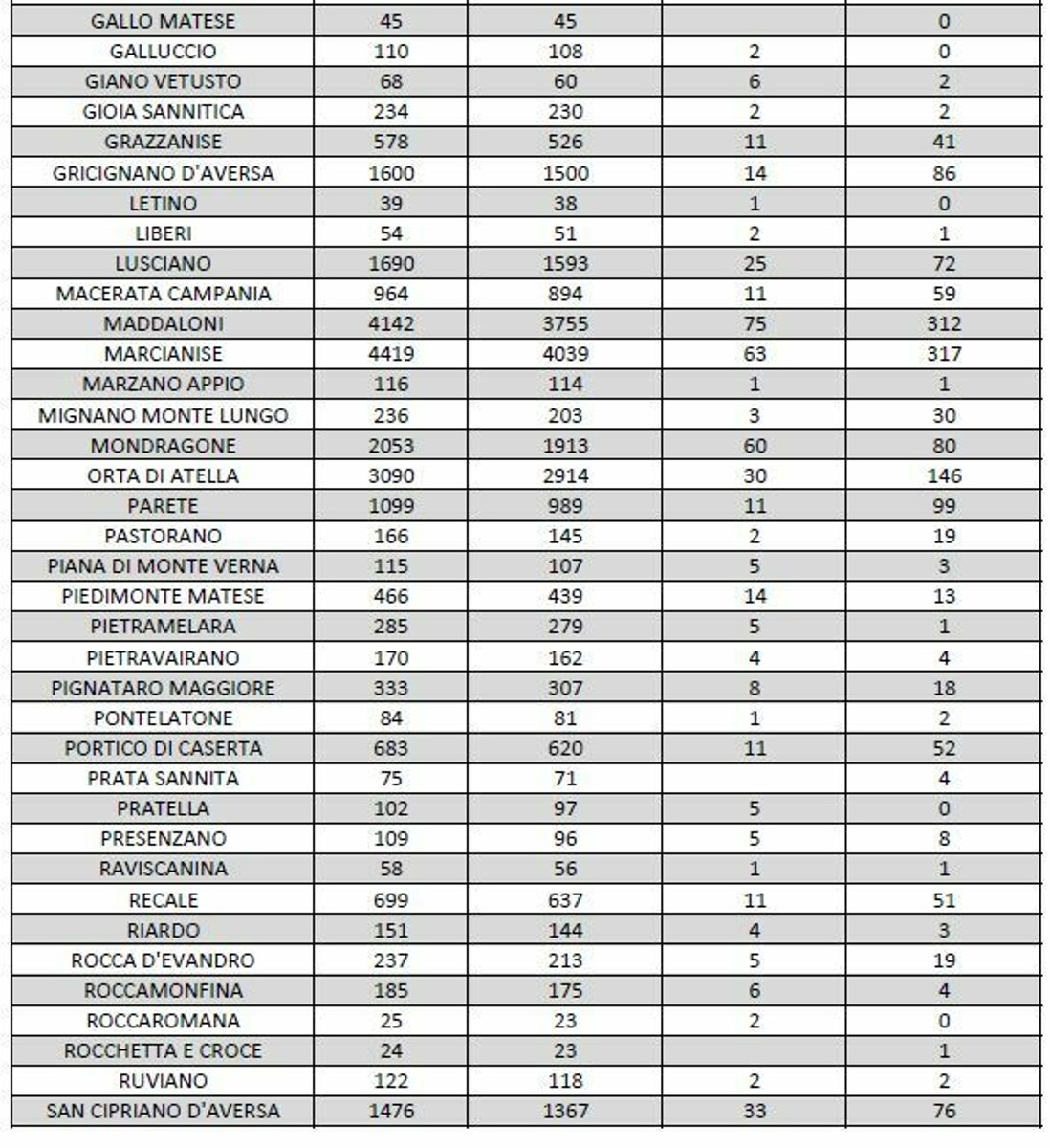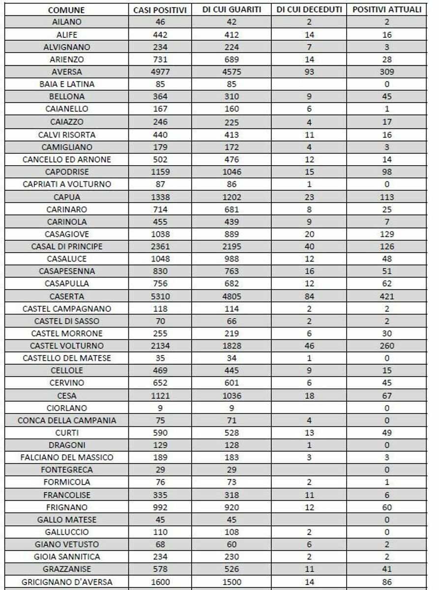 La città col maggior numero di positivi è diventata Caserta, con 421 casi. 100 in più circa rispetto ad Aversa, con 309. Castelvolturno con 260, Maddaloni e Marcianise rispettivamente a 312 e 317 attuali positivi e Santa Maria Capua Vetere con 213 casi di contagio in città sono i comuni con il maggior peso positività in provincia di Caserta.