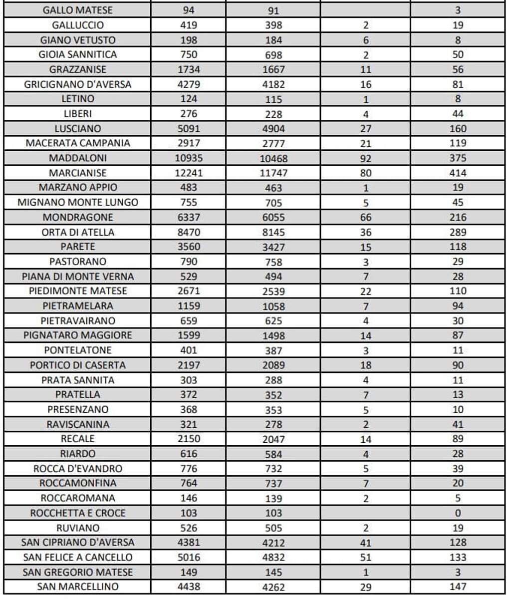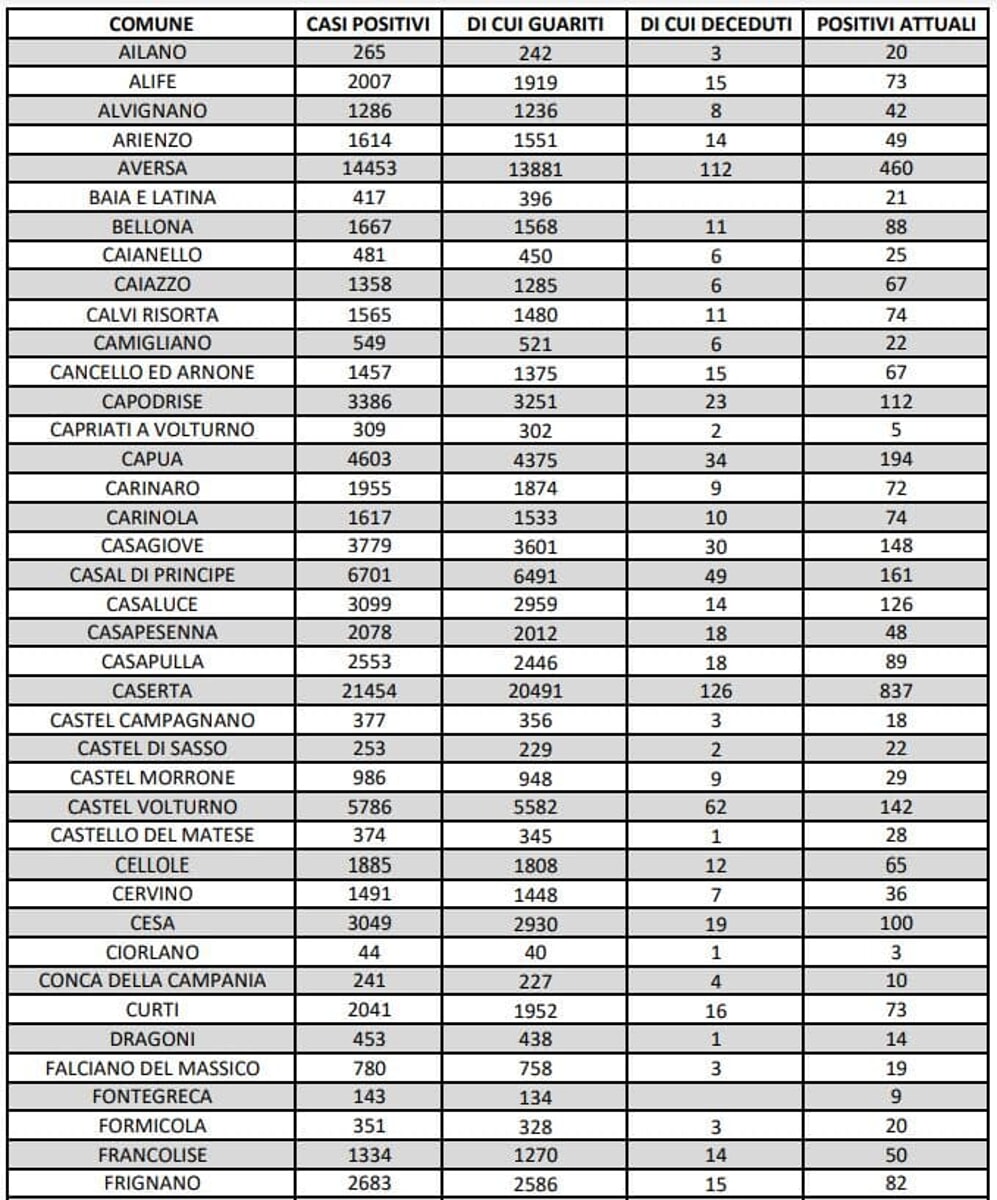 Caserta resta il comune con il numero più alto di soggetti positivi al coronavirus, attualmente, infatti, ne sono 837.