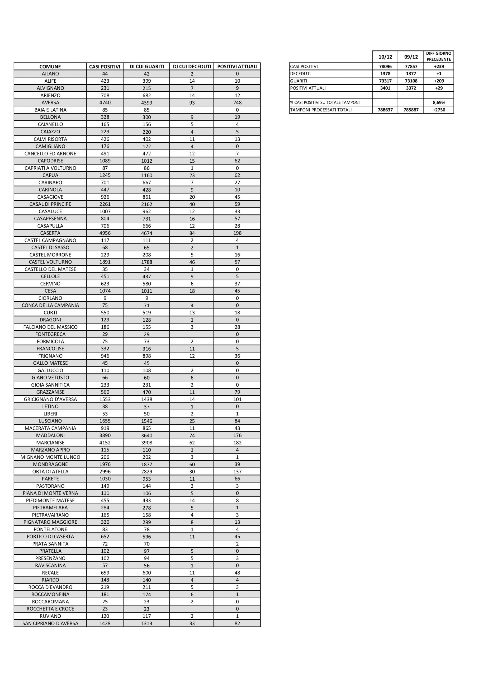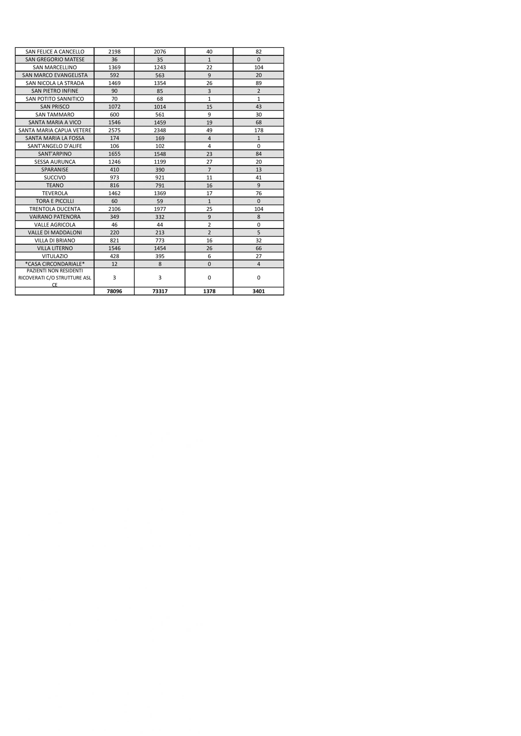 La città col maggior numero di contagiati resta Aversa, dove sono 248 gli attualmente positivi. Segue Caserta con 198, Marcianise con 182, Santa Maria Capua Vetere con 178, Maddaloni con 176, Orta di Atella con 137.