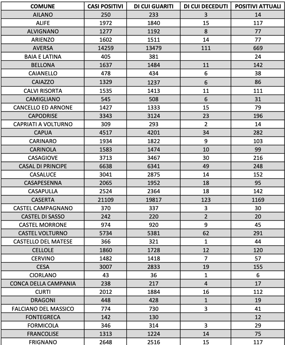 COVID A CASERTA. I DATI DELLA DOMENICA. L’ASL ufficializza oltre 680 casi, ma i guariti sono quasi il doppio . LA TABELLA COMUNE PER COMUNE E LE CITTÀ PIÙ COLPITE