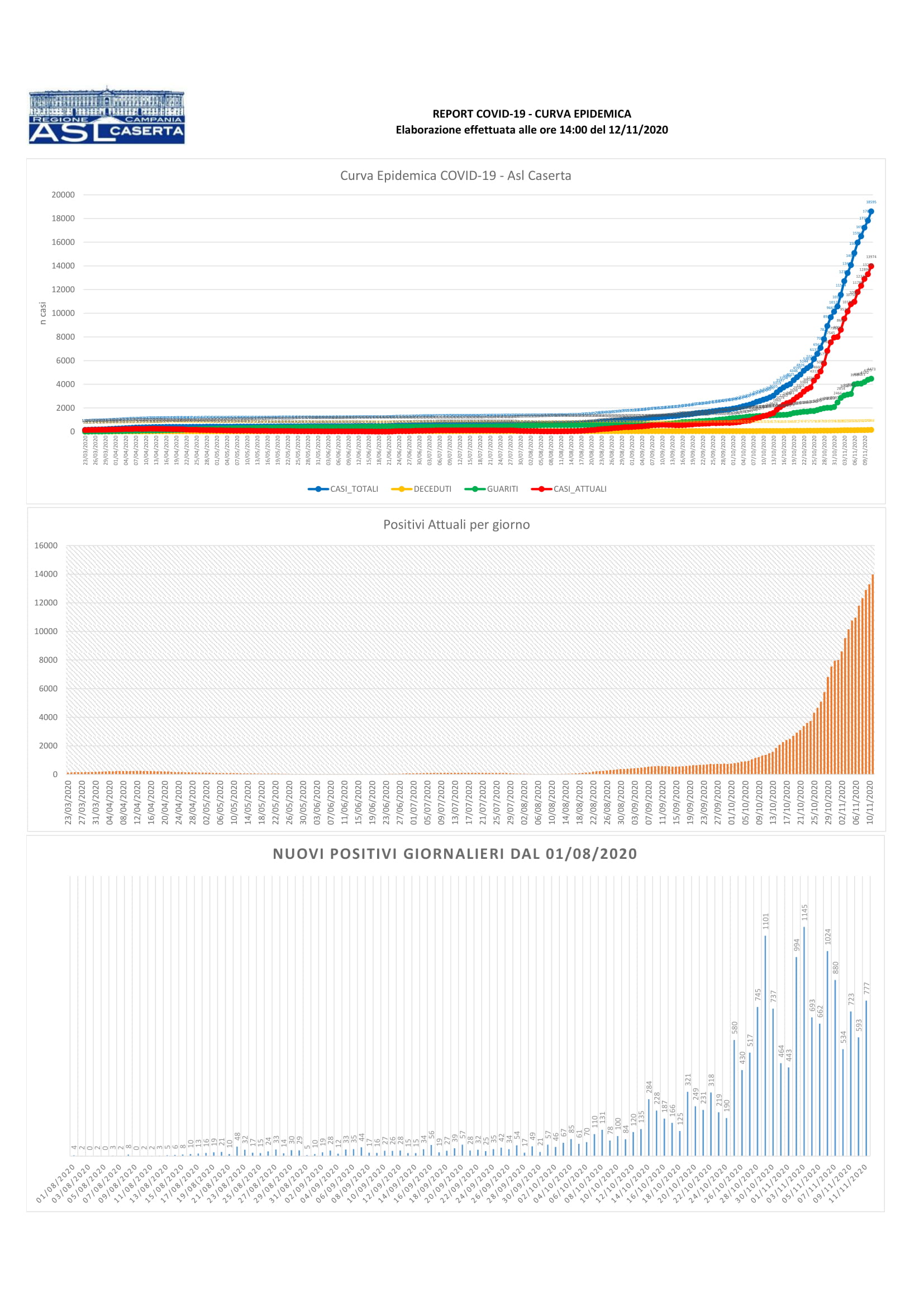 CASERTA (red.cro.) – In questi minuti, l’Asl Caserta ha reso noto i dati relativi alla provincia di Caserta e i casi di contagio di oggi, 12 novembre, dati aggiornati alle 14, con tutti i numeri relativi i 104 comuni della provincia.