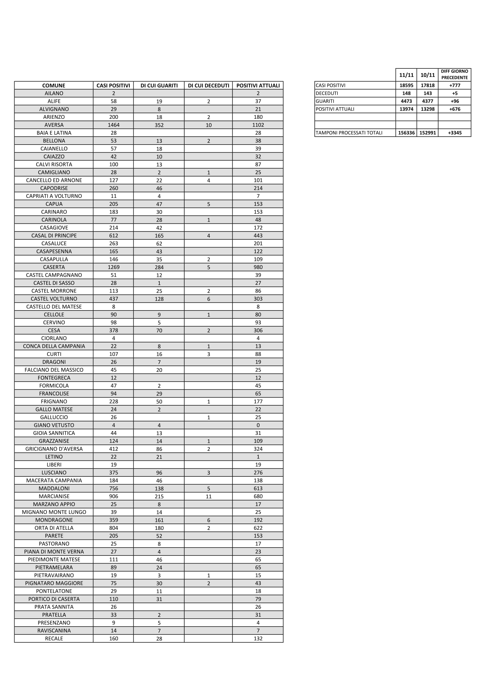 CORONAVIRUS. CASERTA E PROVINCIA. +777 nuovi contagi nelle ultime 24 ore, quasi 100 guariti. LA TABELLA COMUNE PER COMUNE