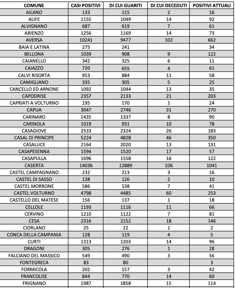 Al momento solo la città di Caserta supera la soglia di 1.000 positivi, 1.041, in calo rispetto alle scorse settimane.