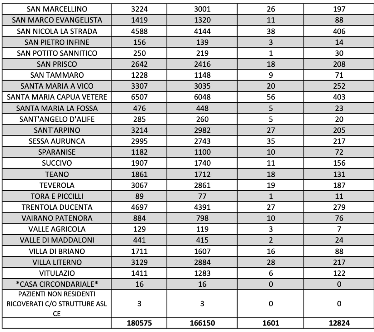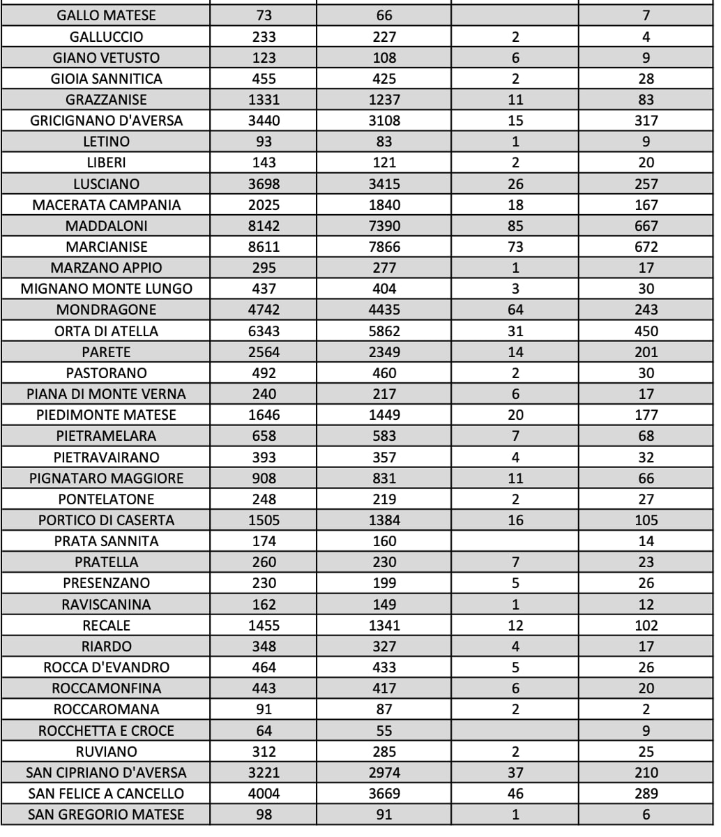Oltre 600 positivi attuali, invece, ad Aversa (662), Marcianise (672) e Maddaloni (667). Alto il dato relativo agli attualmente contagiati anche a San Nicola La Strada e Santa Maria Capua Vetere, rispettivamente con 406 e 403 positivi.