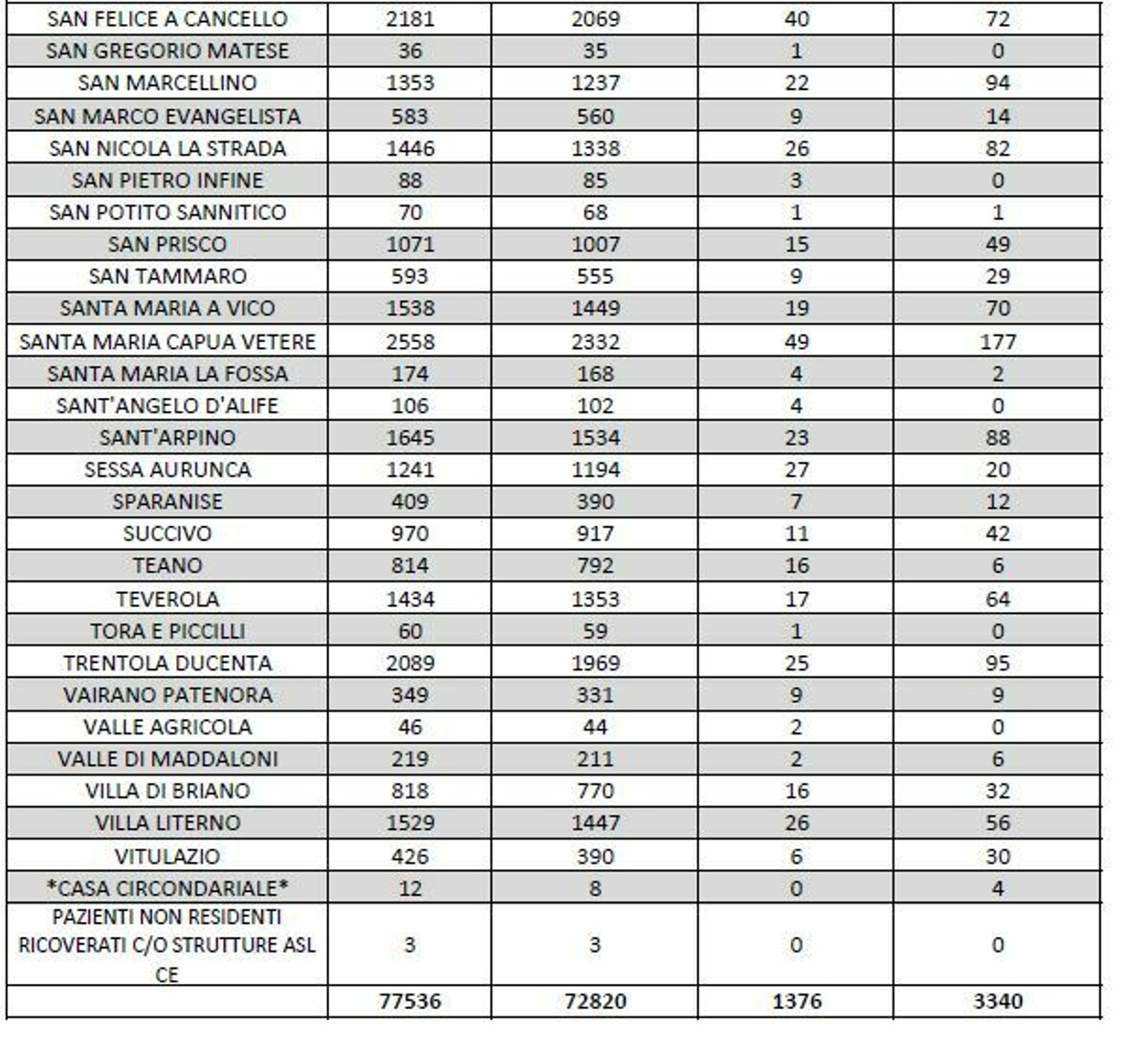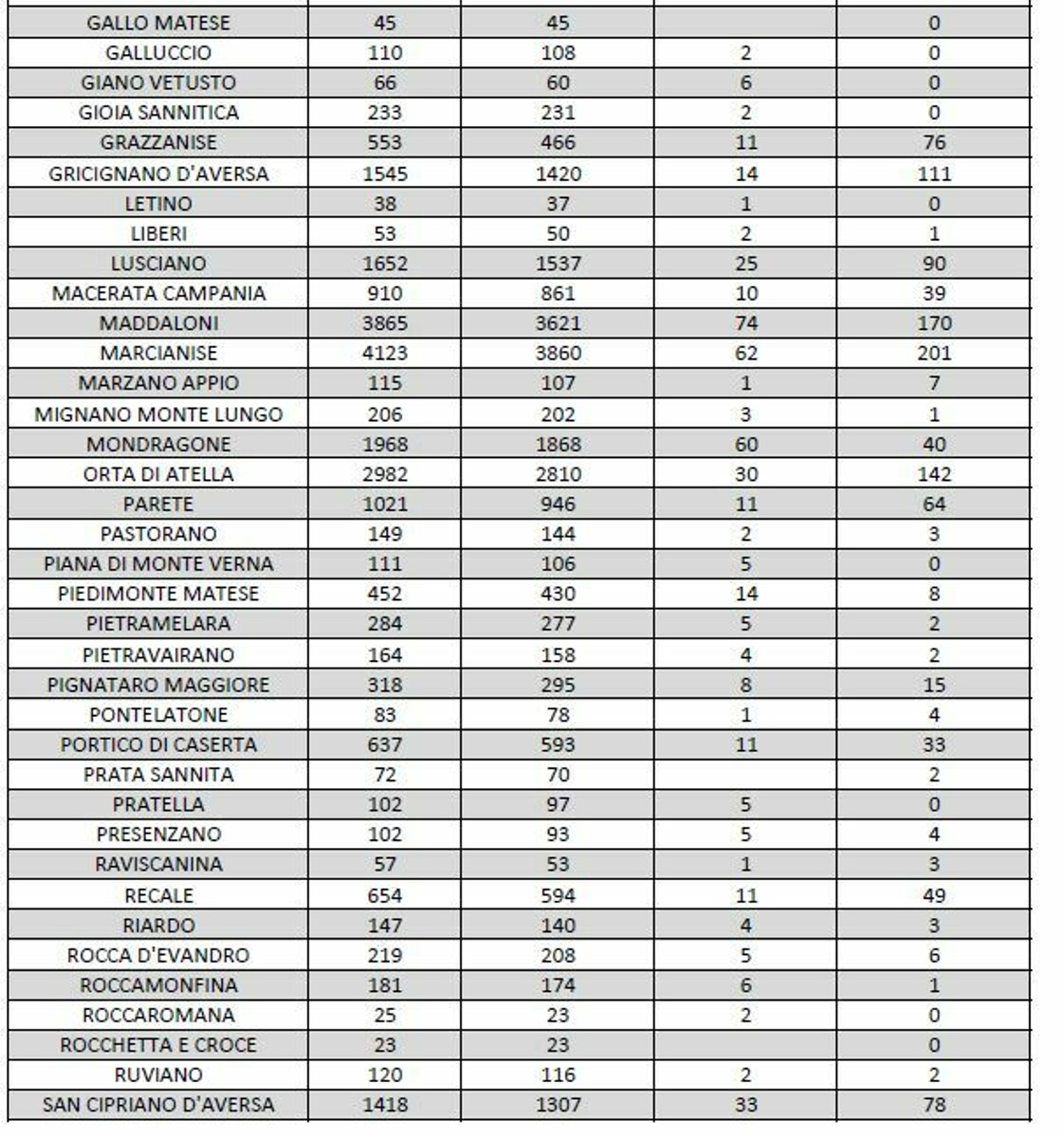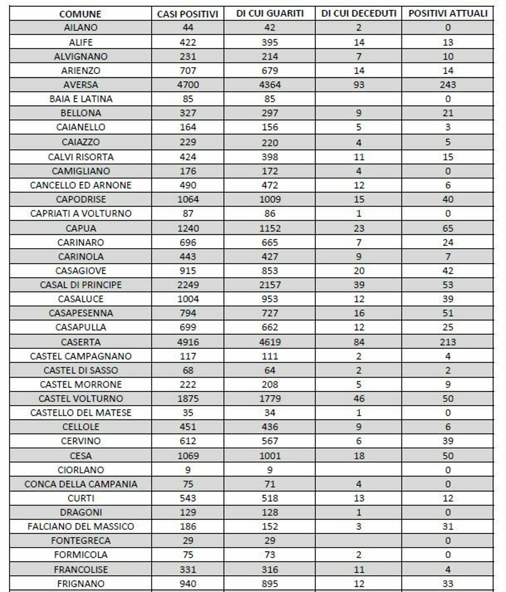 Sono questi i dati più importanti relativi alla pandemia e segnalati oggi nella tabella della ASL di Caserta.