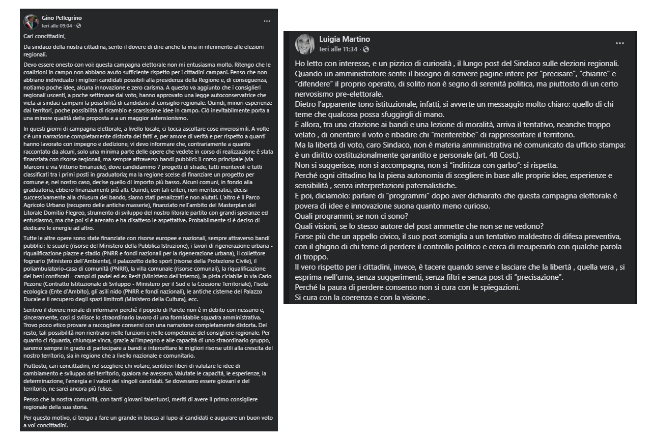 E allora scriviamola questa frase cruciale che per la prima volta un sindaco di questa provincia ha il coraggio di mettere nero su bianco: “In questi giorni di campagna elettorale, a livello locale, ci tocca ascoltare cose inverosimili. A volte c’è una narrazione completamente distorta dei fatti e, per amore di verità e per rispetto a quanti hanno lavorato con impegno e dedizione, vi devo informare che, contrariamente a quanto raccontato da alcuni, solo una minima parte delle opere che vedete in corso di realizzazione è stata finanziata con risorse regionali, ma sempre attraverso bandi pubblici. […] Tutte le altre opere sono state finanziate con risorse europee e nazionali, sempre attraverso bandi pubblici. […] Sentivo il dovere morale di informarvi perché il popolo di Parete non è in debito con nessuno e, sinceramente, così si svilisce lo straordinario lavoro di una formidabile squadra amministrativa. Trovo poco etico provare a raccogliere consensi con una narrazione completamente distorta.“
