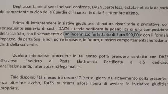 In caso di mancato pagamento, DAZN si riserva di intraprendere ulteriori azioni legali contro i destinatari.