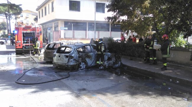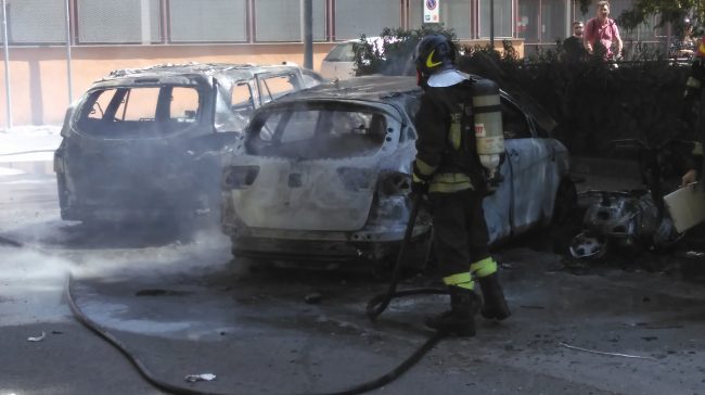 AVERSA (Christian e Lidia de Angelis) – Grave incendio divora e distrugge 2 auto e uno scooter. Intorno alle 13:15 circa in Piazza Bernini ad Aversa, uno scooter ha sprigionato delle grosse fiamme che in poco tempo hanno avvolto completamente il mezzo, poi si sono estese alle vetture in sosta accanto, nei pressi di un noto bar. Le fiamme hanno distrutto totalmente una Seat e una Skoda Fabia. Terrore e panico tra i presenti per le alte fiamme e il nero fumo che ha avvolto completamente il cielo cittadino e le abitazioni circostanti, rendendo l’aria irrespirabile. Allertati immediatamente i vigili del fuoco di Aversa che con un’auto pompa hanno lavorato incessantemente per domare fiamme e fumo. Secondo indiscrezioni l’origine dell’incendio dovrebbe essere un corto circuito, ma al momento non vi è ancora conferma ufficiale. Sul posto anche la volante dei carabinieri della Compagnia di Aversa, che hanno la Caserma poco distante dal luogo dei fatti, per accertare la dinamica dei fatti e sentire i presenti. I vigili del fuoco hanno messo in sicurezza l’area poiché si è temuto che potesse esplodere uno dei veicoli coinvolti. Sul posto anche i sanitari del 118 per alcuni presenti che hanno respirato il fumo e altri che hanno avuto attacchi di panico, pare, nessuno ferito e nessuno in pericolo di vita.