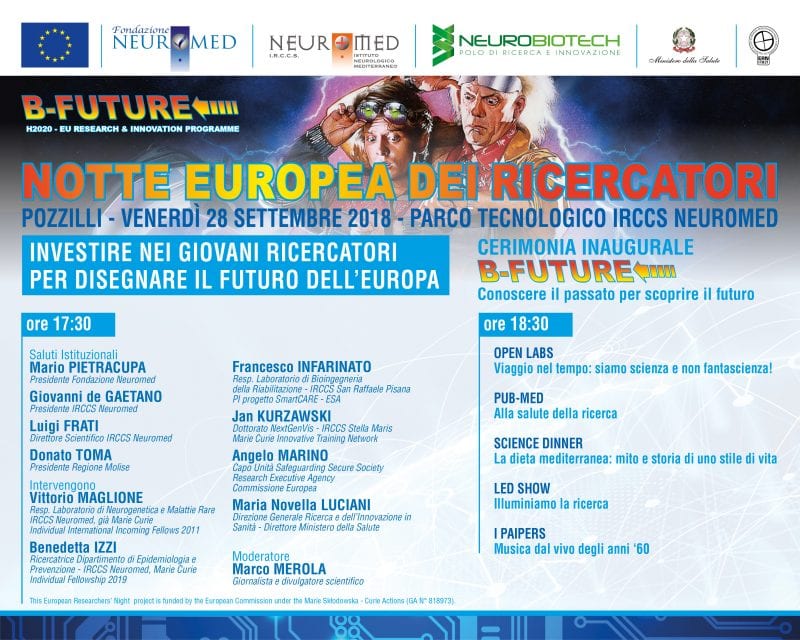 Si arriverà così a venerdì 28 settembre, quando Neuromed ospiterà il simposio “Investire nei giovani ricercatori per disegnare il futuro dell’Europa”, che vedrà il collegamento in diretta con i 26 Istituti di Ricovero e Cura a Carattere Scientifico delle Neuroscienze e della Neuroriabilitazione. Anche il Museo della Scienza di Milano sarà in streaming, collegando il Progetto B-Future all’evento Back to the future – Brain in the space della Fondazione Carlo Besta.