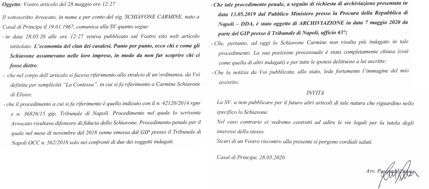 LA LETTERA. L’avvocato di Carmine Schiavone di Eliseo: “Il mio cliente prosciolto”. CasertaCe: “Giusto scriverlo, ma l’ordinanza La Contessa resta in cima alla nostra playlist”