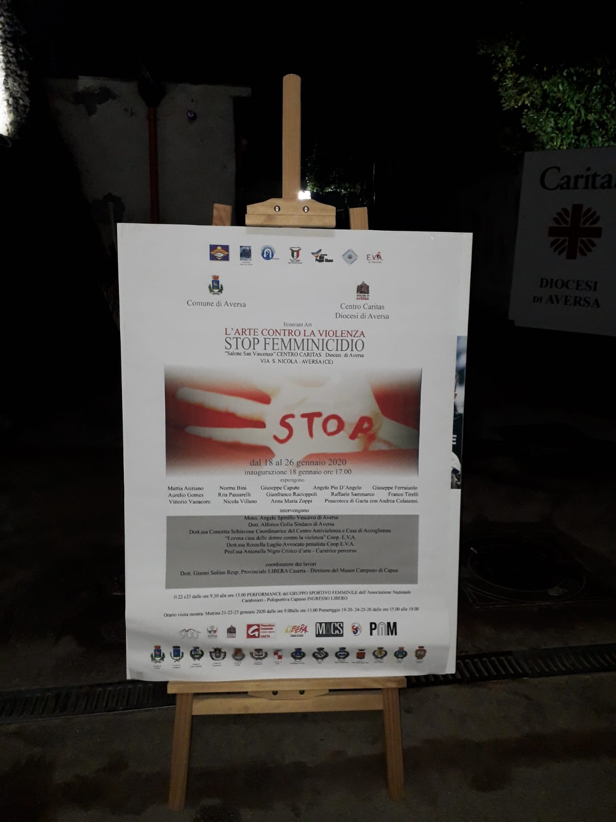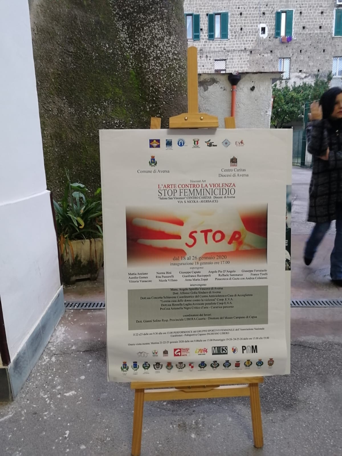 AVERSA – E’ stata inaugurata sabato pomeriggio, nel “Salone Vincenzo” Centro Caritas Diocesi di Aversa, la mostra “L’Arte Contro La Violenza” STOP FEMMINICIDIO. All’iniziativa, che rientra nel progetto Itinerant Art, hanno partecipato Mons. Angelo Spinillo, Dott. Alfonso Golia Sindaco di Aversa, Dott.ssa Concetta Schiavone Coordinatrice del Centro Antiviolenza e casa di Accoglienza “ Lorena casa delle donne contro la violenza” Coop E.V.A., Dott.ssa Rossella Luglio Avvocato penalista Coop E.V.A. , Prof.ssa Antonella Nigro Critico D’arte – Curatore Percorso, Coordinatore dei lavori – Dott. Gianni Solino Resp. Libera Caserta – Direttore del Museo Campano di Capua, Coordinatore degli Artisti Partecipanti al Percorso – Prof. Giuseppe Ferraiuolo.