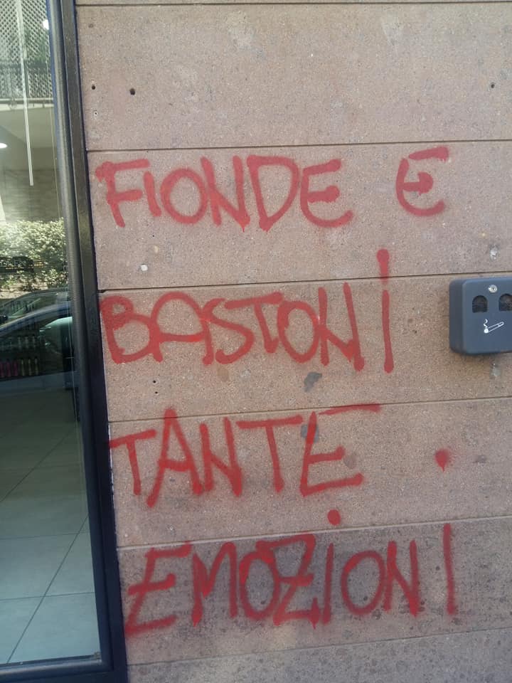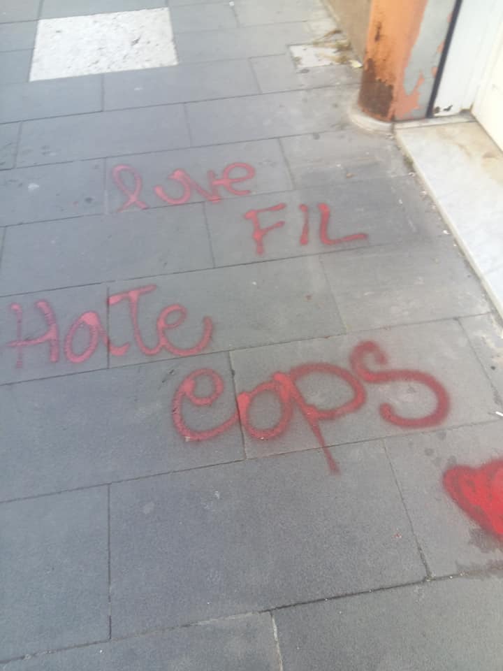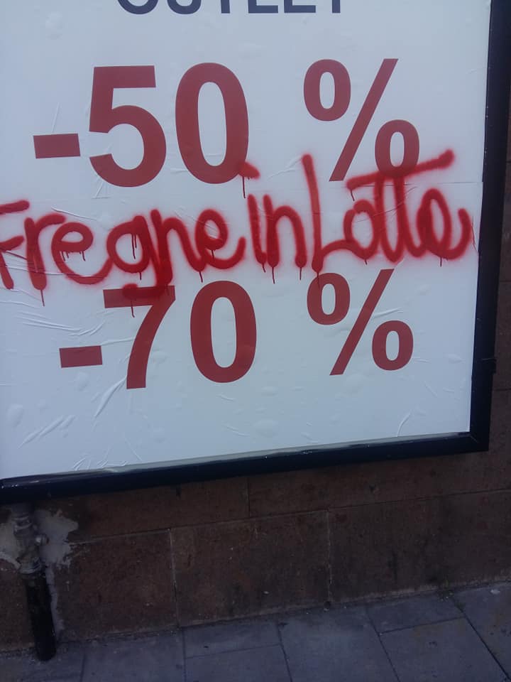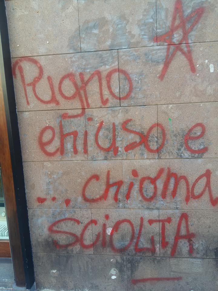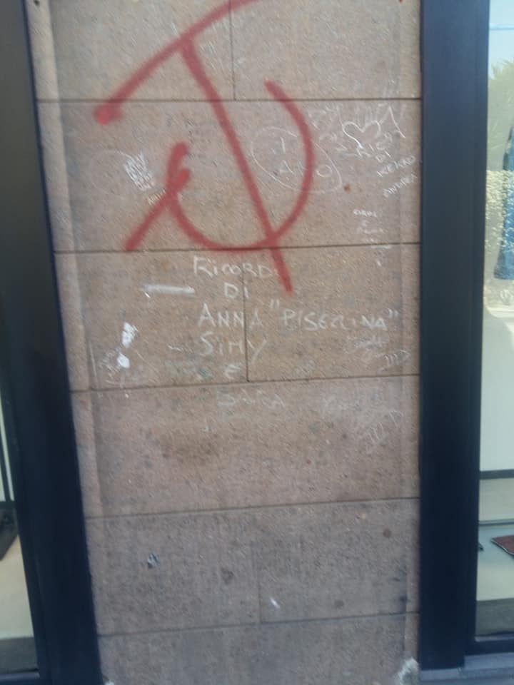 AVERSA (Lidia e Christian de Angelis) – Stamani diversi commercianti di via Corcioni hanno fatto l’amara scoperta i muri e le vetrine danneggiate da scritte inneggianti la lotta e l’avversione per le forze dell’ordine, con la firma di una falce e martello. Frasi sconnesse, che forse celano un fumus di protesta che bolle in pentola, un anticipo di un’intenzione bellicosa da parte di un manipolo di soggetti di pseudo sinistra, che vogliono vandalizzare la città.