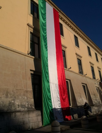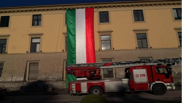 LE FOTO. Con il tricolore, i vigili del fuoco vestono a festa il palazzo della prefettura