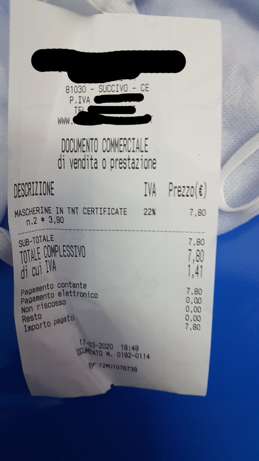LE FOTO CORONAVIRUS. “Parafarmacia vende mascherine artigianali senza certificazione e confezionatura”