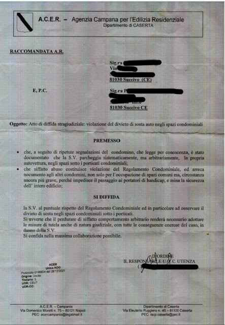 “Abito in un parco popolare di gestione dell’Acer Campania qui a Succivo. Mia mamma essendo in carrozzina non ha il diritto di passeggiare sotto i porticati del palazzo al fresco o a riparo dalle intemperie solo perché si è consolidato nel tempo il fatto che i porticati sono di uso esclusivo per parcheggiare, nonostante l’amichevole sollecitazione di rispettare il problema grave della disabilità, e di mettere in atto il buon senso, non c’è stato verso di far ragionare gli inquilini, mi sono rivolto al sindaco, che non è intervenuto, mi sono rivolto all’Acer nel far rispettare il loro stesso regolamento che non permette il parcheggio sotto i porticati.