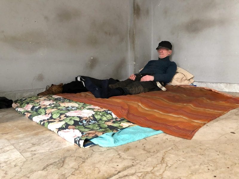 L’uomo dorme qui da anni, riposando in un letto di fortuna. Nessuna istituzione si occupa di lui. Un barbiere lo rasa a zero periodicamente mentre qualche persona di buon cuore gli prepara da mangiare. Si reca alla Caritas per lavarsi. Non è dato sapere se gli sia mai stato assegnato un tutore legale o una remunerazione statale.