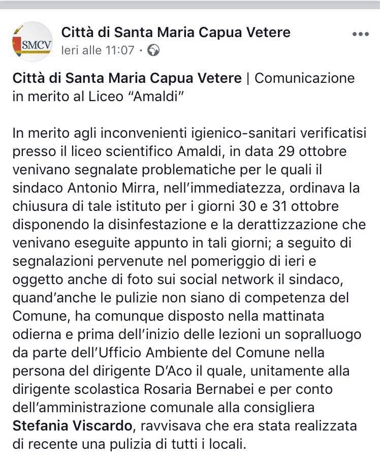 A tentare di stemperare le lamentele degli studenti e dei loro genitori, ci ha provato la pagina Facebook “Città di Santa Maria Capua Vetere”, tramite un post pubblicato alle ore 11.07 dell’altroieri, martedì 6 novembre.