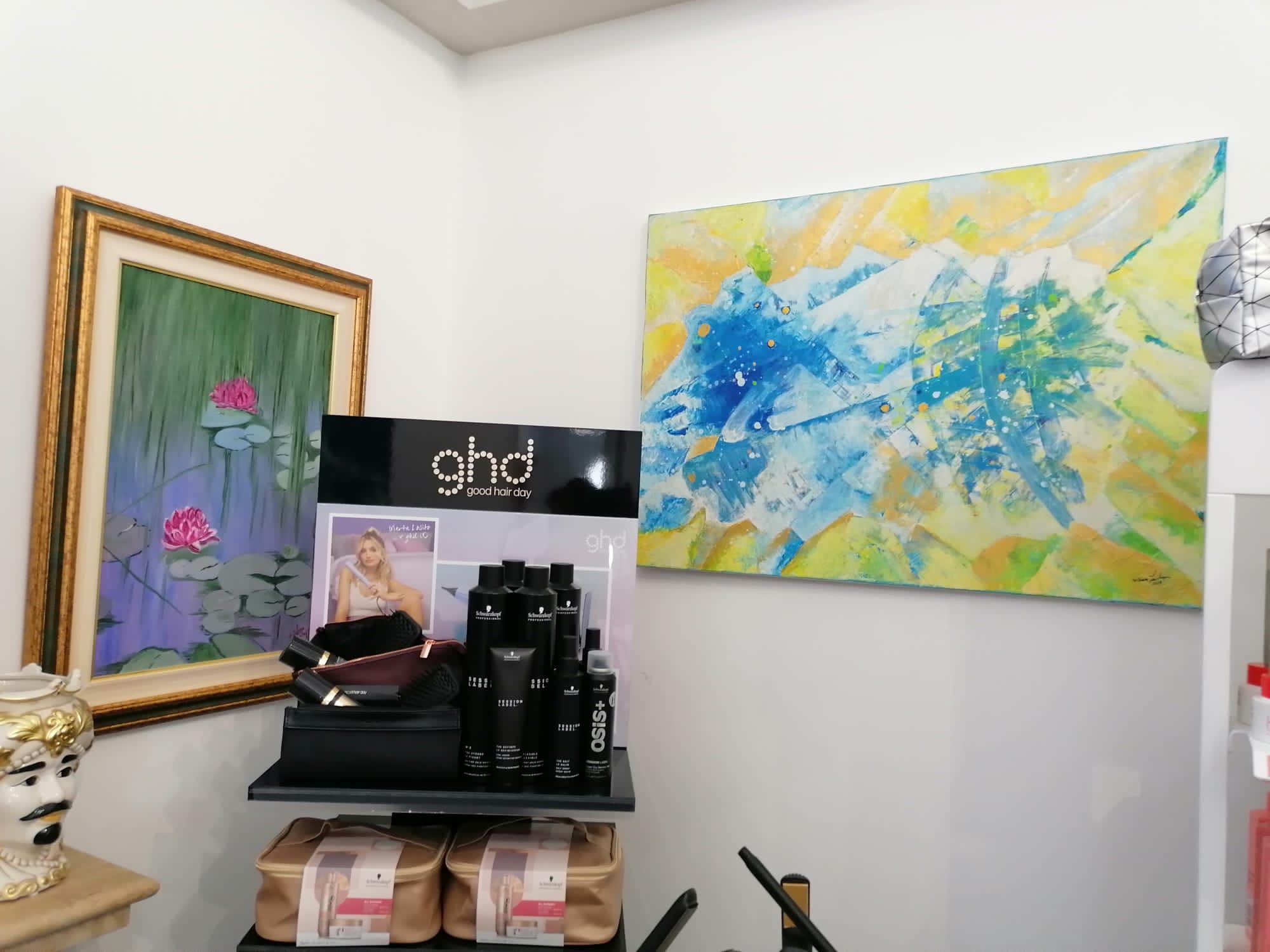 “Il piacere di disegnare, ha spiegato Siham Lachgar, mi accompagna da sempre e amo l’arte in tutte le sue forme. Ho studiato e mi sono diplomata alla Scuola Superiori delle Belle Arti di Casablanca, specializzata in designer di interni, mi sono messa alla prova su stili diversi, alla ricerca di un mio linguaggio. Solo negli ultimi tempi sono riuscita a trovare una forma espressiva più personale ma sempre in perenne mutamento con la mia emotività nella quale riesco a esprimermi in modo efficace”. Gli spazi del salone diventano quindi delle insolite location e tra un taglio e uno shampoo, diventa possibile ammirare i quadri con l’obiettivo di divulgare l’interesse per l’arte, ma anche quello di creare dei contrasti visivi e trasformare i locali commerciali in delle vere e proprie gallerie, inusuali appunto.