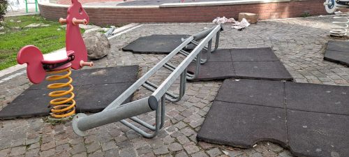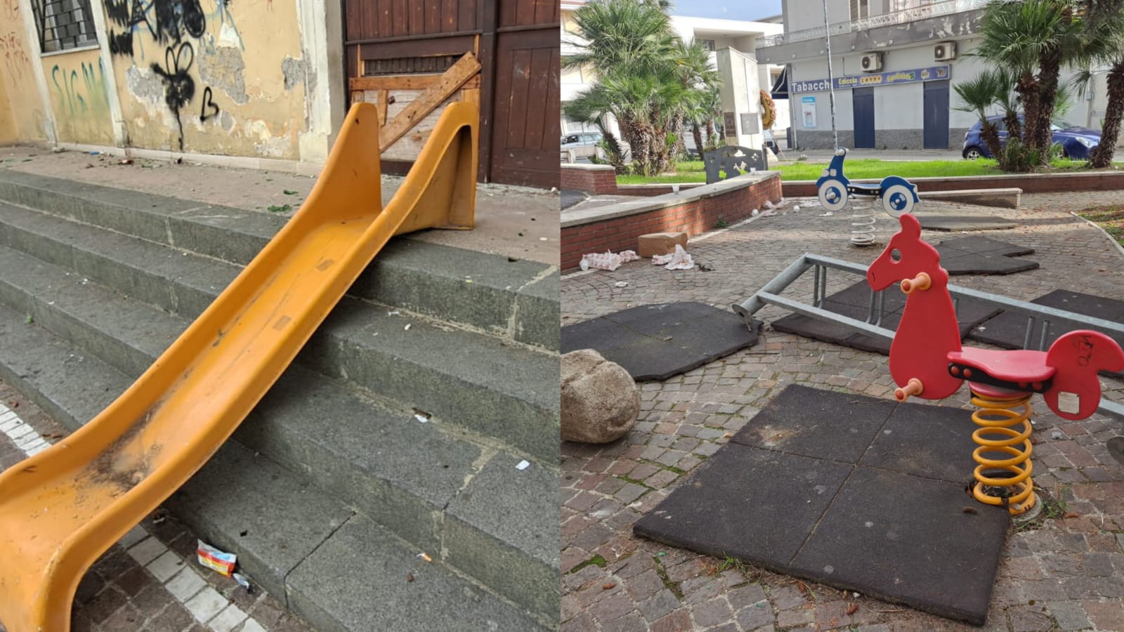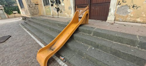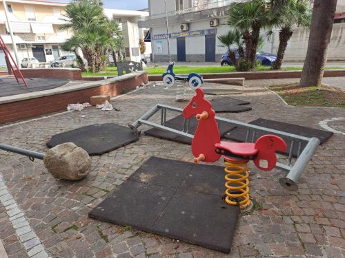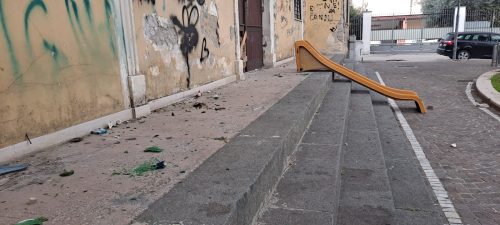 L’ultimo episodio, accaduto con molta probabilità nella serata di ieri, ha visto lo scivolo smontato e posto sulle scale dell’edificio Ex GeoEco. Una sorte simile è toccata anche ai tappetini antiscivolo, rimossi dalle giostrine per essere poi gettati, in maniera disordinata, attorno alla piazzetta. Altre ancora sono le strutture che ne hanno fatto le spese, come le altalene prive di sellino e giochi divelti.