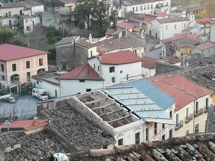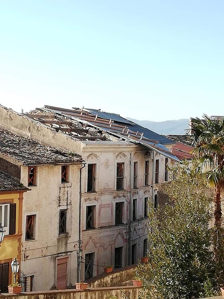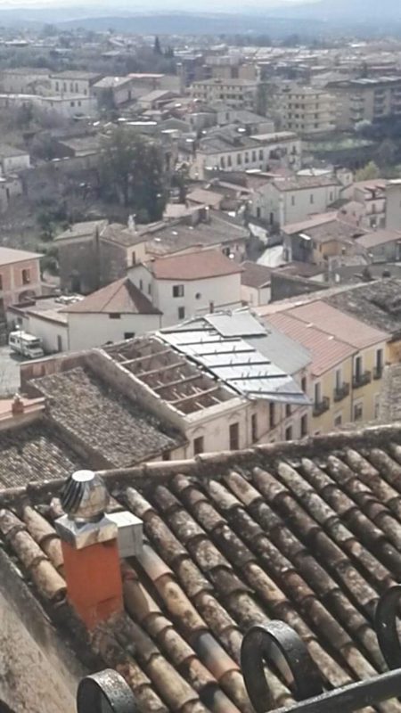 LE FOTO VENTO DI GRECALE SENZA PIETA’ A PIEDIMONTE MATESE. Vola via l’enorme tetto di Palazzo Caruso e finisce sul palazzo a fianco