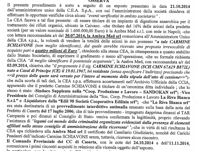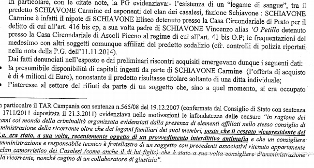 Capitolo interdittiva antimafia: la prima riguarda la Riva Bianca srl. Per il momento non è precisato se Carmine Schiavone abbia avuto o meno quote al suo interno, ma è certo che lui è stato vicepresidente del consiglio di amministrazione e che questo abbia inciso nella decisione della prefettura di Caserta sull’interdittiva.